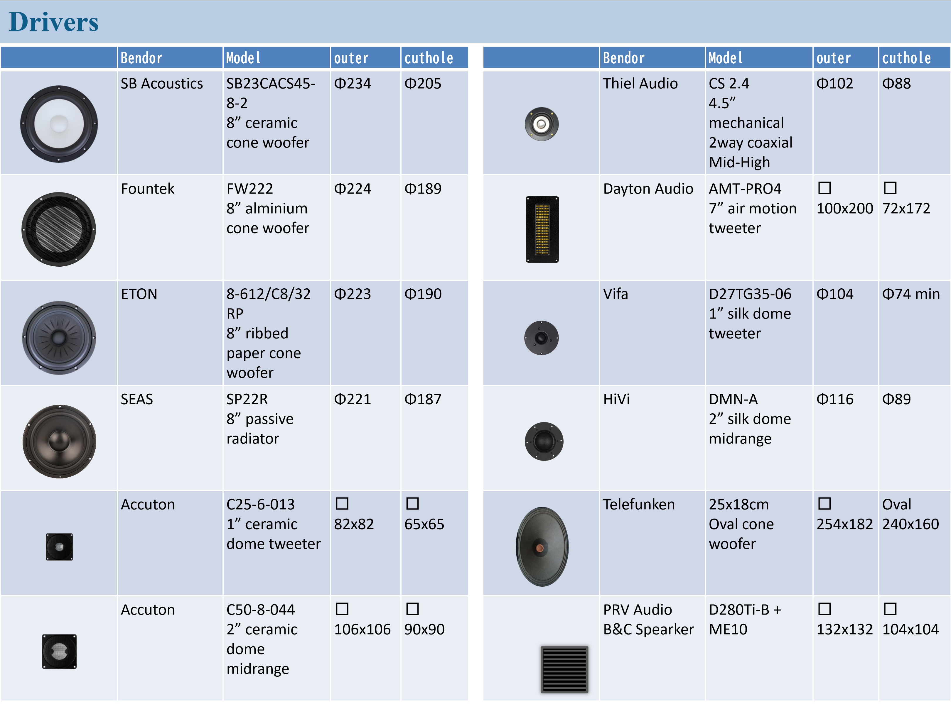 本機のドライバーリストです。とんでもない数ですね。12種のドライバですか?これらを組み合わせすることで、合計5種類のスピーカーシステムへ展開可能にします。5種類中1種類は制作していないのでオプションですが、早晩追加することになるでしょう。 (^-^;)