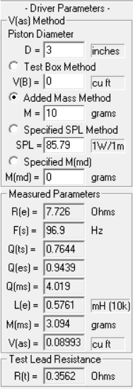 Vas(equvalent Volume of Air Suspension) の測定方法はいくつかありますが、ここでは最もかんたんなAdd Mass Methodをご紹介します。付加質量を振動系へ加えたときと、加えなかったときで、FsとQの変動を算出し、そこから非付加時のVasを逆算するというものです。