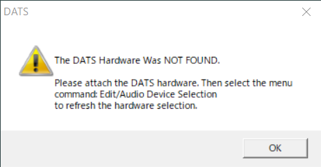 まず、DATS V2 PCソフトを起動すると下図のようにハードウェア(以下、デバイス)が接続されていないというエラーが表示されます。