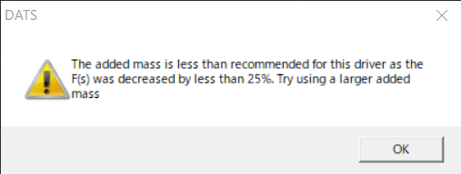 これは錘が軽すぎて、Fsの変動が25%未満だからです。錘の質量を大きめにしてリトライしてください。一般に、元々のMmsと同等、振動系が軽い場合はさらに2倍以上の錘が必要となるようです。