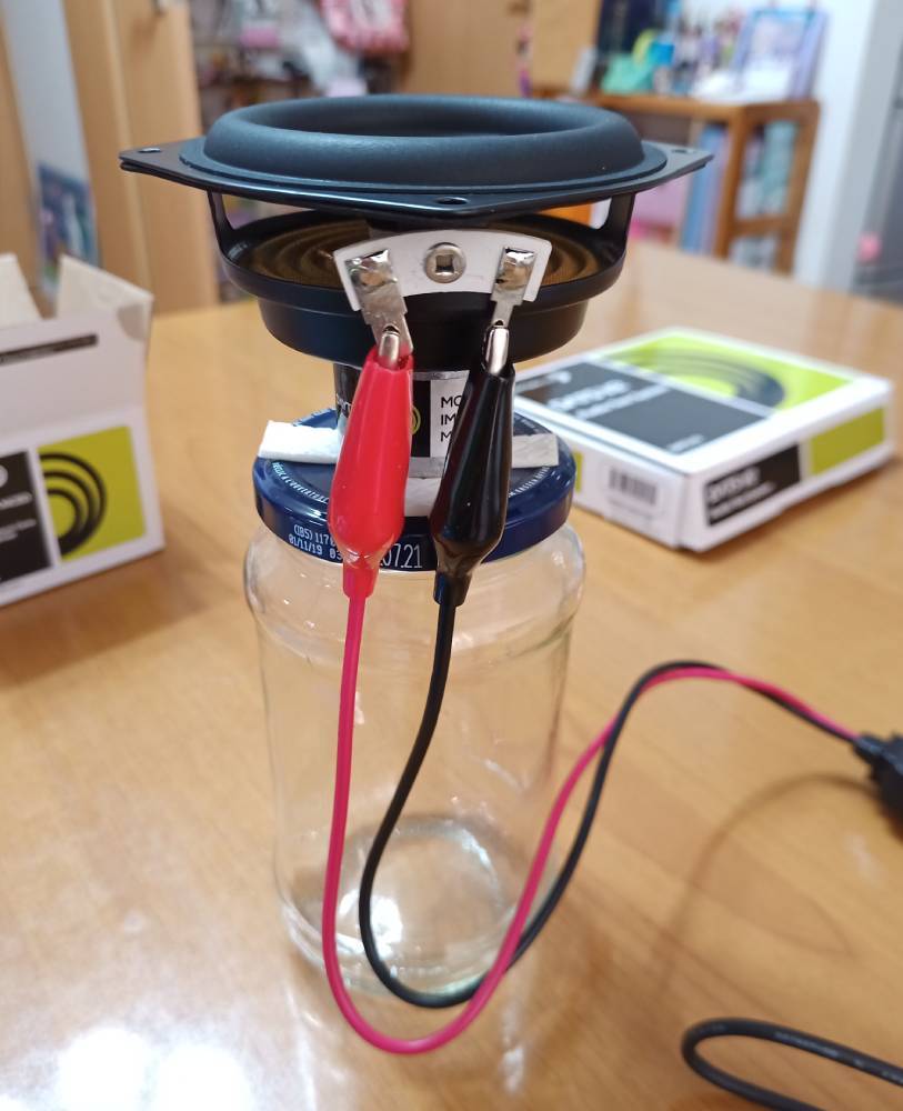たとえば、この写真のようにポールピースを浮かせるアタッチを着けた背の高い瓶を用意すると良いかもしれません。台は頑丈で鳴かないものが好適です。
