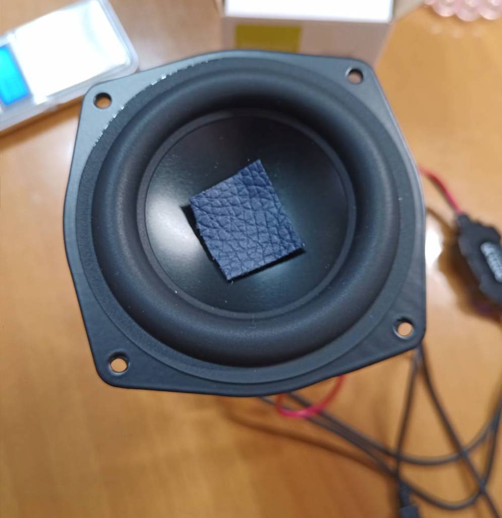 ドライバーの振動板上へ、ダイアフラムを痛めないよう慎重に付加質量を乗せます。