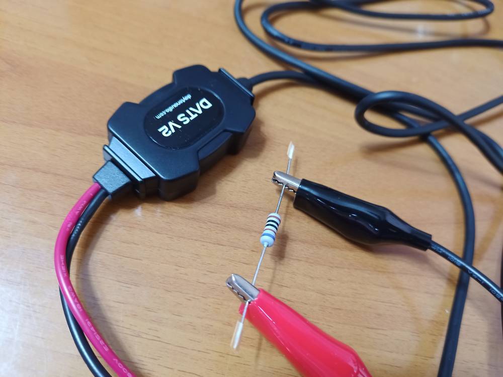 DATS V2には精度±0.1%の酸化金属皮膜抵抗1kオームが付属されていますので、これをテストリードに接続します。