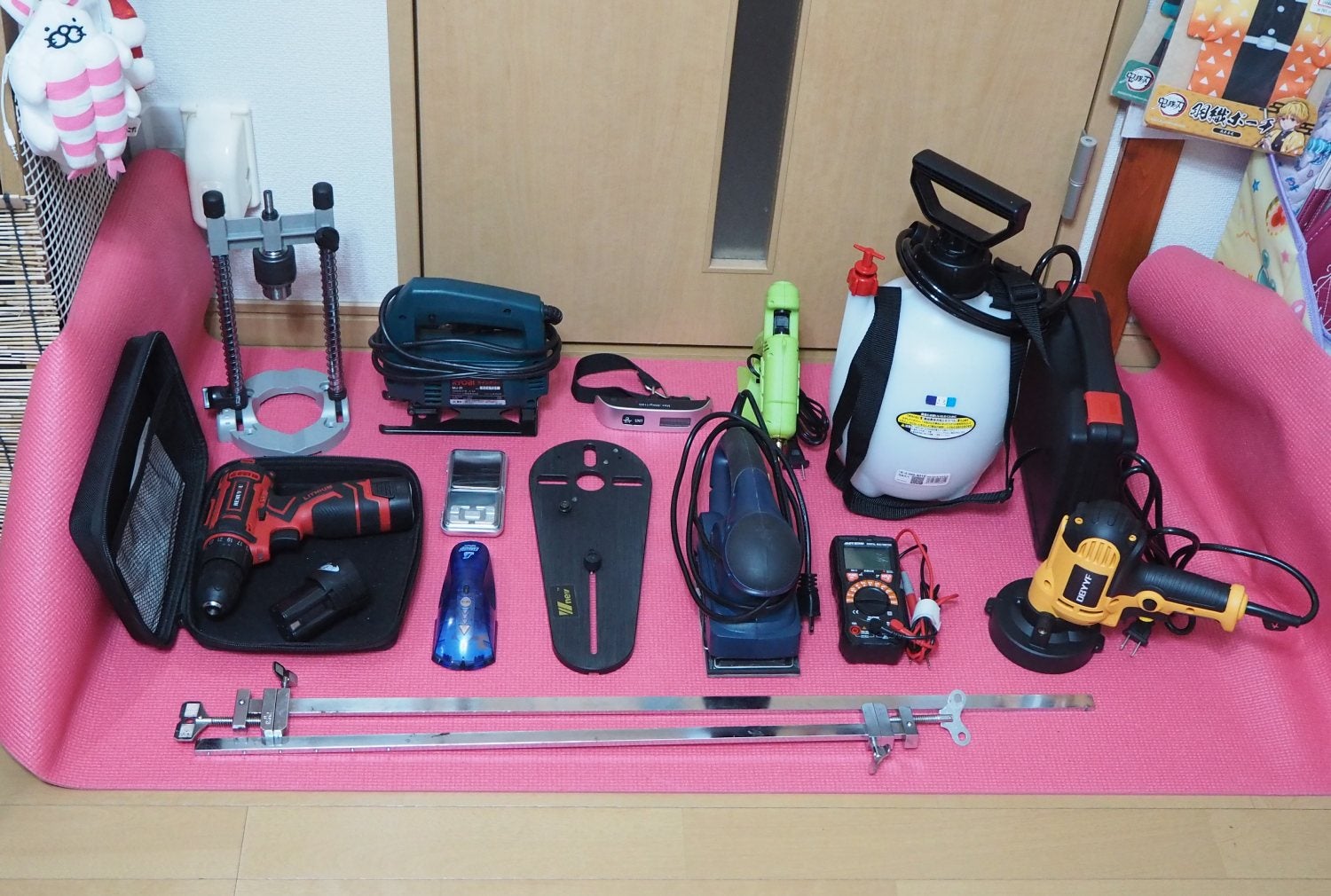 ついでなので、主だった電動工具類やツールを並べてみたのがこちら。