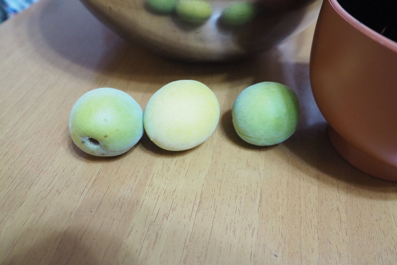 本当は天ぼしが良いのでしょうが、家内曰く虫が寄ってくるそうなので、屋内で少し放置するだけ。買った時はもっと青々していましたが、だんだん黄ばんできましたね。梅酒は青いうちに漬けなければいけないのだとか?買ってからも時間勝負なのですね〜