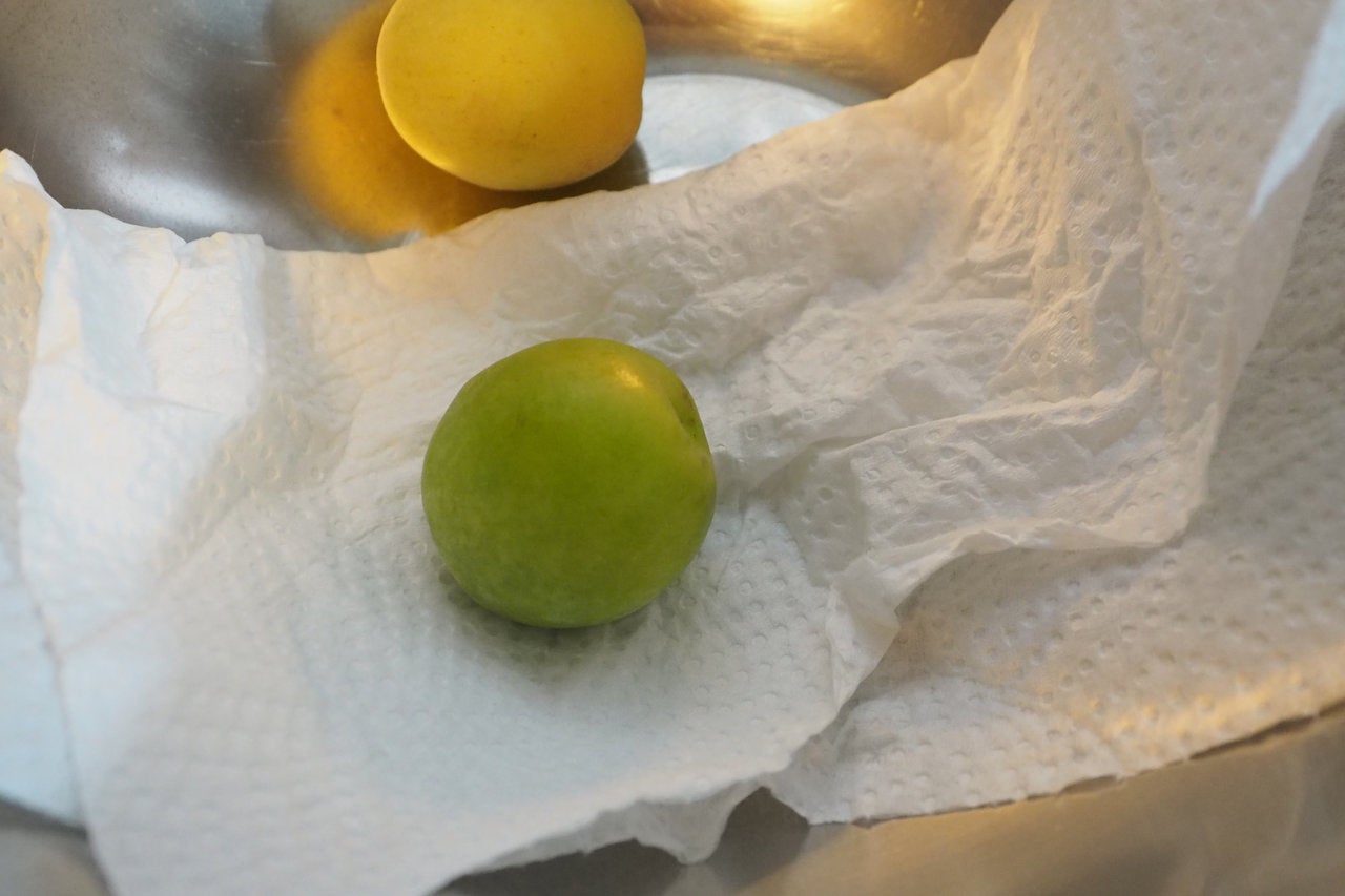 綺麗なタオルを使うそうですが、うちにそんなものは無いので(笑)キッチンペーパーを使います。ここで手抜きしないようにします。少しでも水分が残っていると梅酒が腐敗しやすくなります。