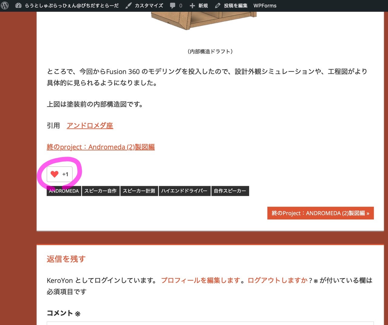 私が選んだ「テーマ」では、コメントはデフォルトで入れられるようになっているのですが、「いいね」はできません。イイねはWP標準では無いらしのです。