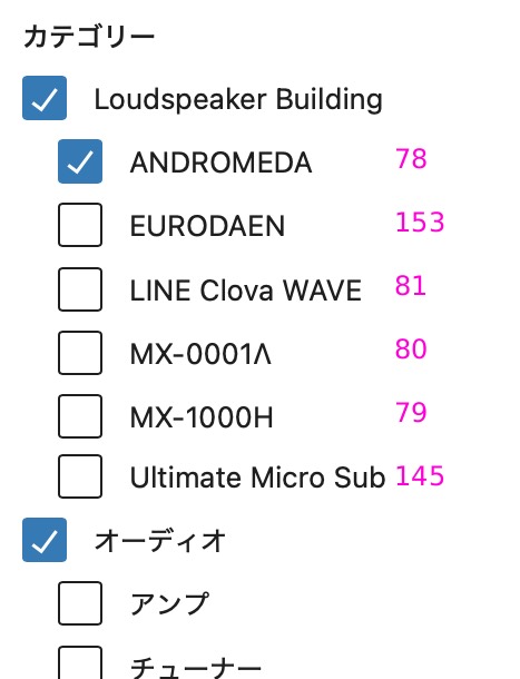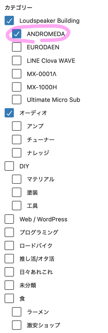 ANDROMEDA連載の場合は、上記カテゴリの「Loudspeaker Building」「ANDROMEDA」「オーディオ」の3つのカテゴリにフラグを立てています。