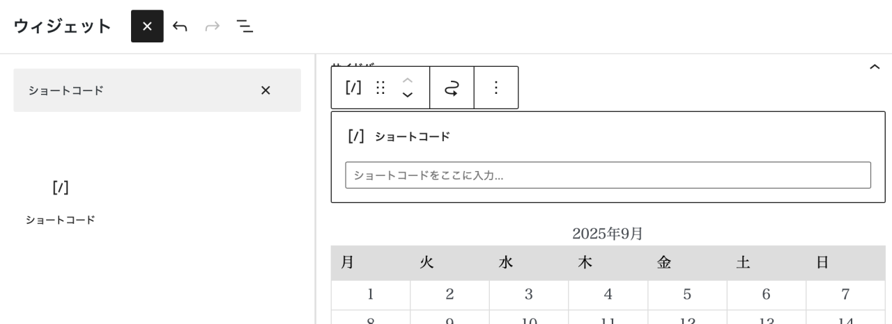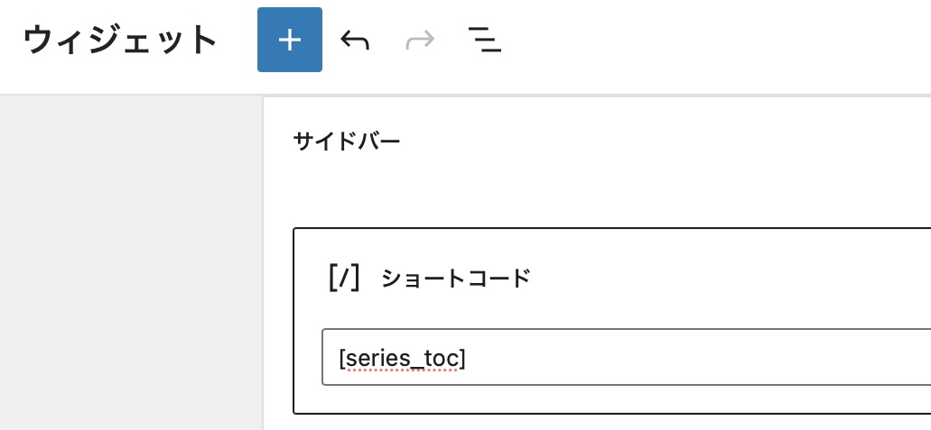 2. 「+」ボタンを押し、→検索欄で「ショートコード」を打って探し、→ウィジェット群に追加します。
