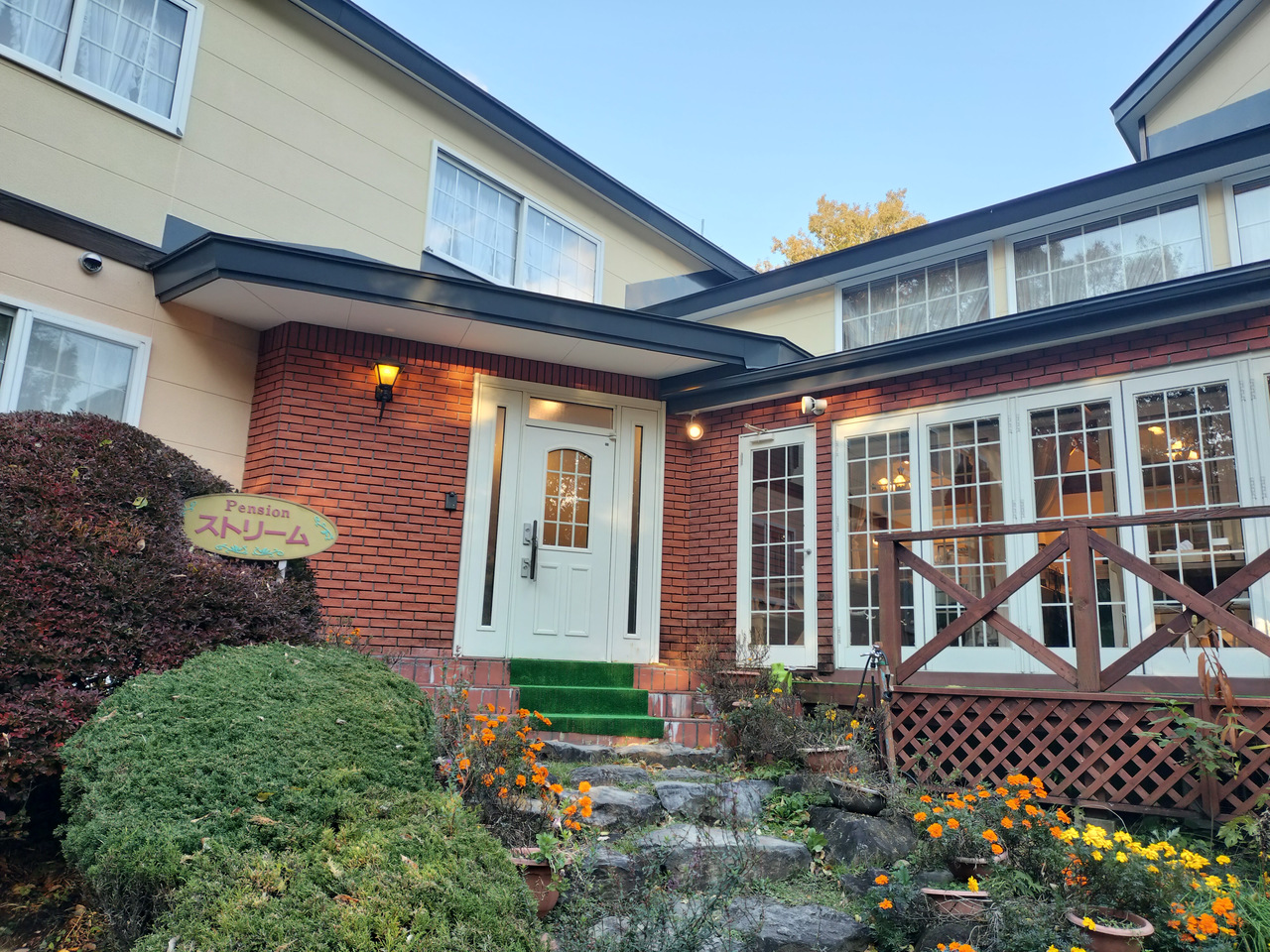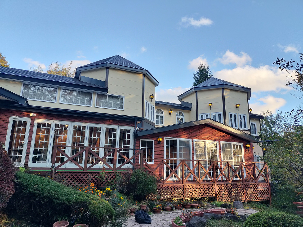 お泊まりはこんな所。温泉つきのペンションです。可愛らしい建物。