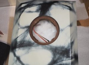 吸音材を設置していないし、配線もしていないじゃないか。手を突っ込めなかったらどうすんだ?? ホッとひと安心。MH90の穴径は意外に大きくて、楽勝で手が突っ込めるようです。これなら配線も吸音材も大丈夫。3インチを切るような小口径だと、接着後に内部の作業がまるでできなくて慌てることがあります。要注意。