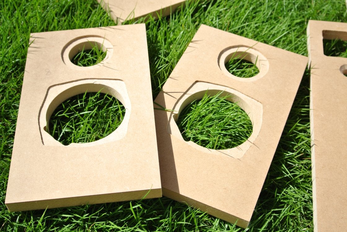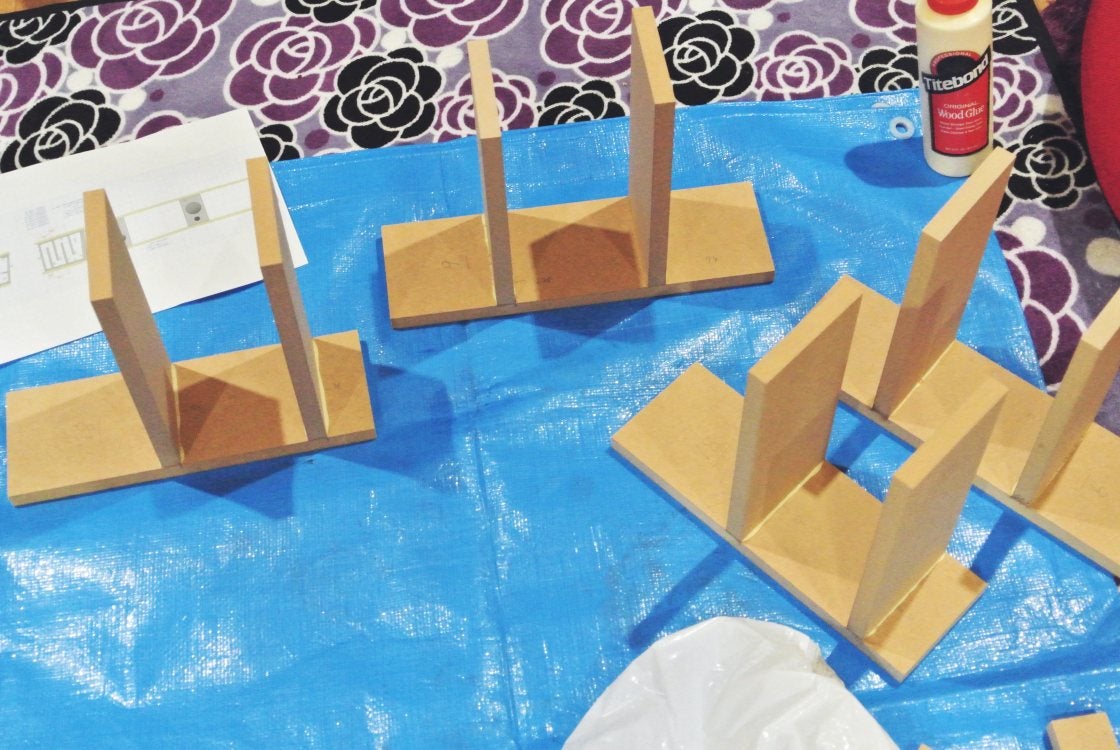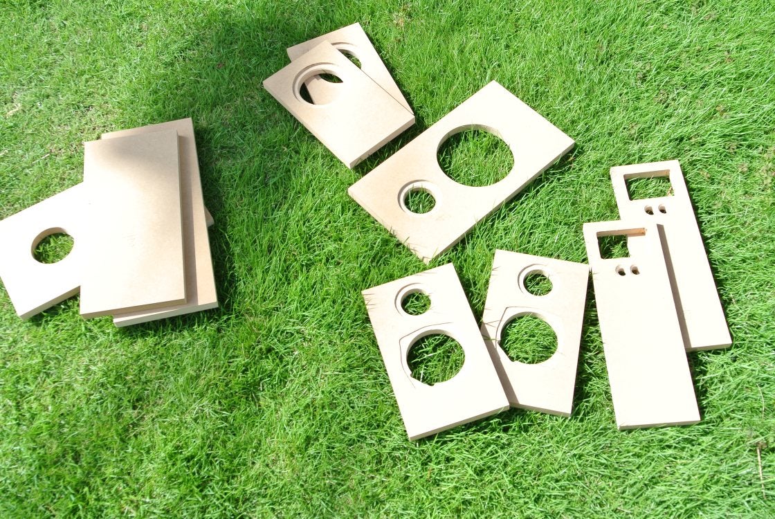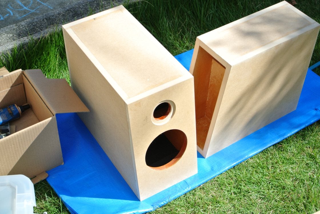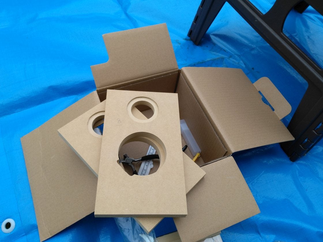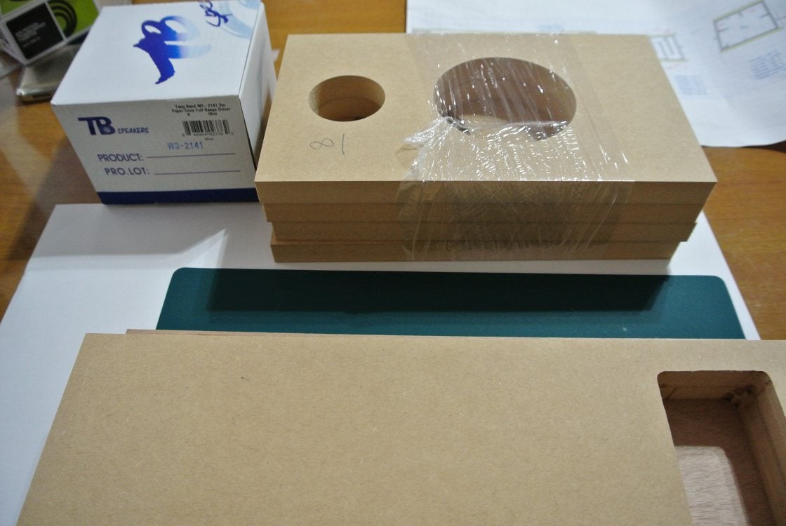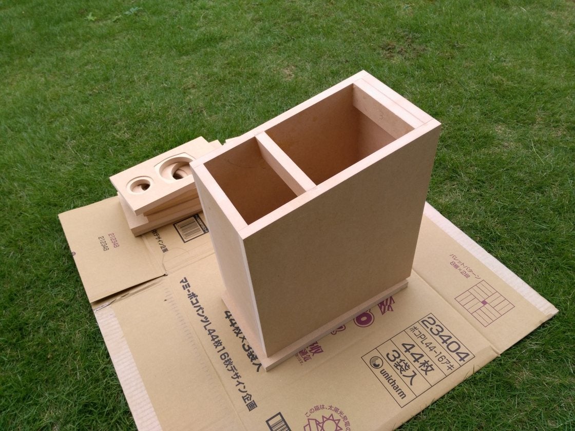 構造が入り組んでてもすべてが小型ですから、3x6ft (1820×910) のMDF x2枚で、スピーカー3本とサブウーファー1本が全部出来てしまうんです。(上下の棚板は除く。)