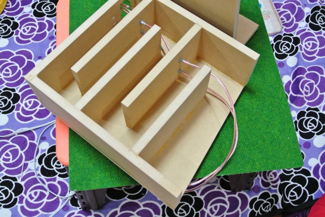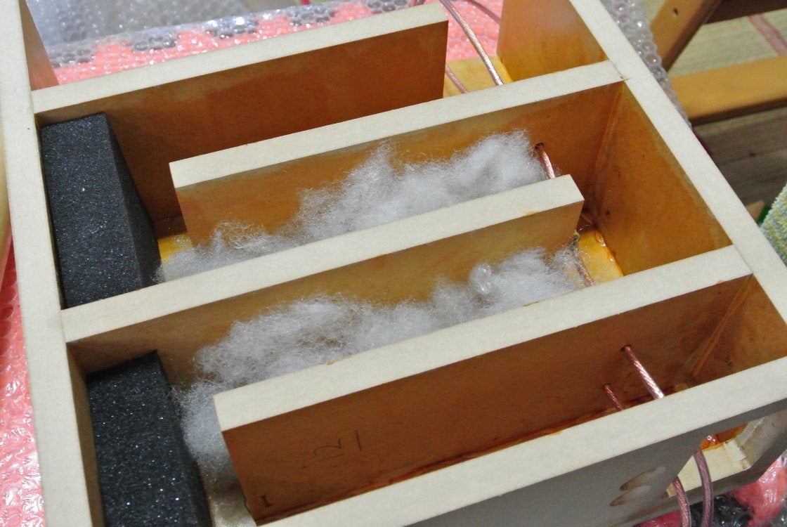 トランスミッションラインは、組み上がってしまうと手が届かなくなってしまいます。早い段階で、ケーブルと吸音材を設置します。実際にはこの写真より吸音材はツメツメにしました。吸音スポンジ、粗毛フェルト、アク-スタスタッフを併用します。