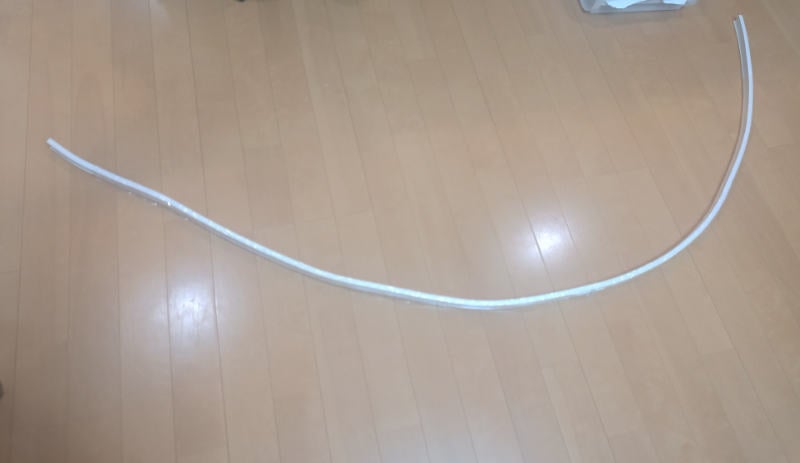 こういう、ぐにゃぐにゃ曲げられるフレキシブルなカーテンレールというものがあるのですね。中には鉄心が入っていて、自由に曲げることができます。これを適当な長さに切って、ラックに貼り付けてみます。