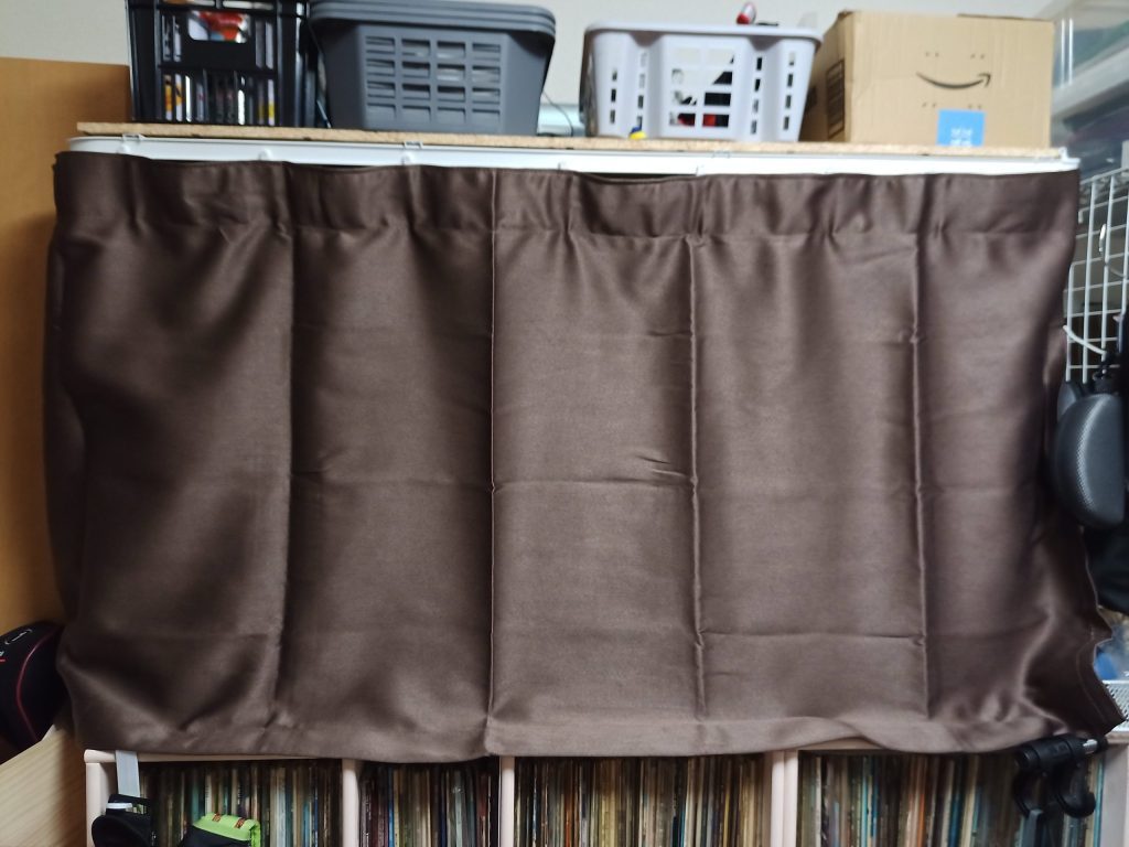そのラックも、経年で埃だらけになるし紫外線を浴びるので、カーテンで覆ってみることにします。