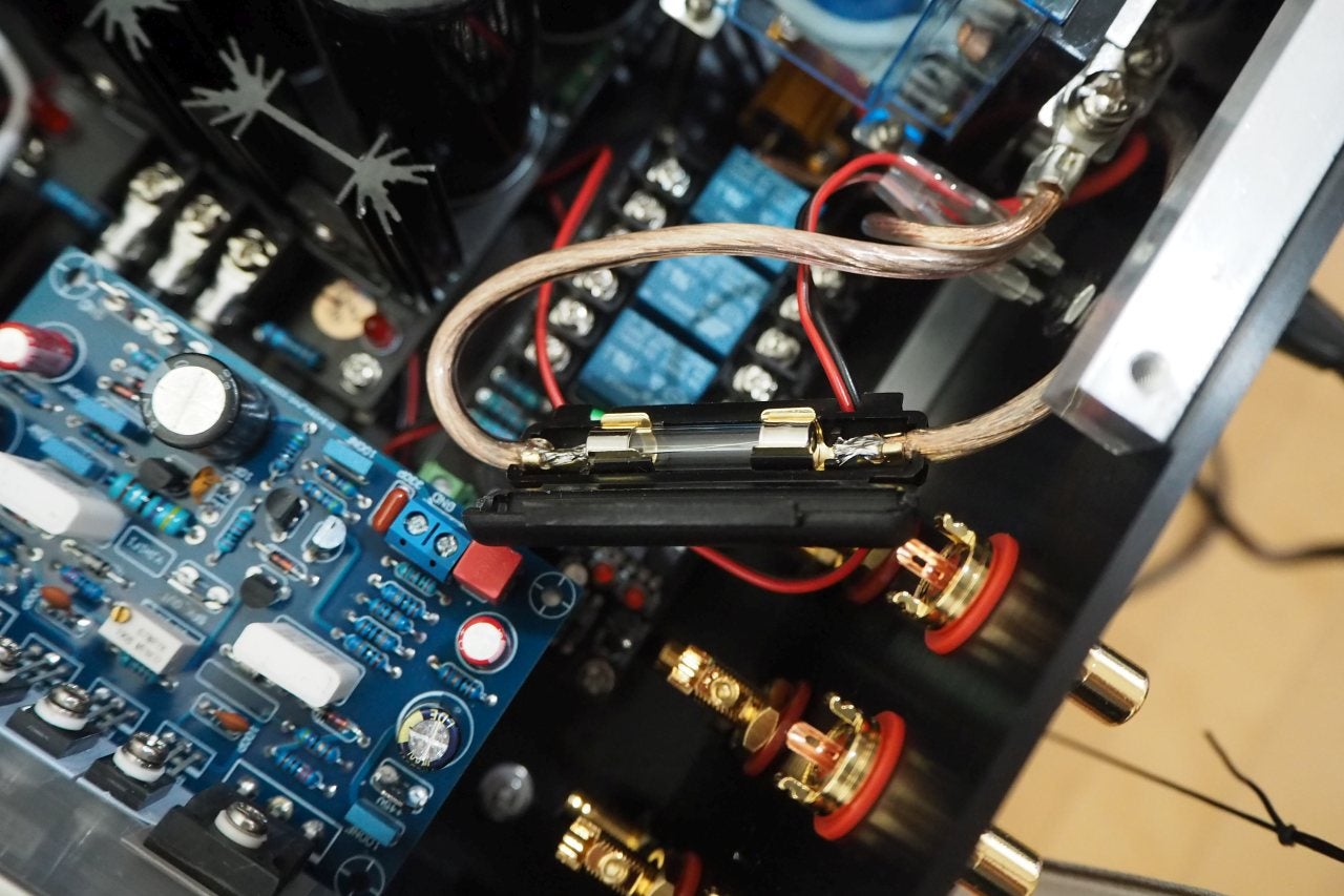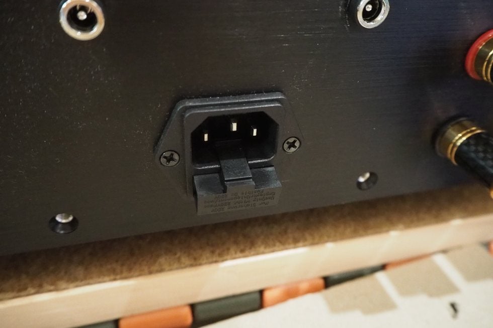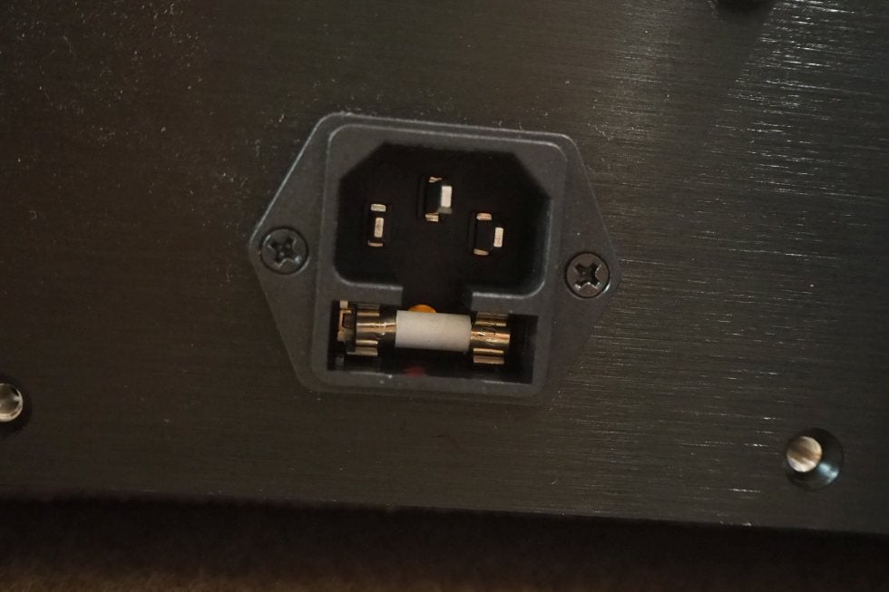 このACインレットはヒューズを内蔵する珍しいタイプ(珍しいというか、最近はこんなタイプが多いみたいです)。インレット下部の引き出しを開けると、ヒューズ挿入口が顔を出すのです。20mmのショートヒューズを内包します。このことを知らなかったため、追加注文しました。ここには20A高耐性のヒューズを封入。便利だなとは思いますが、ここを交換するつもりは全くなし。本当は端子をショートしたいくらいです。