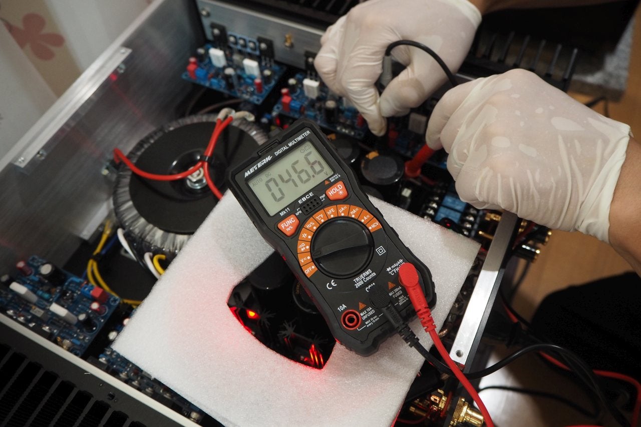 メイン通電リレーは約7秒後にメイクされ、何事もなかったのようです。各部の電圧をチェックします。メイン整流回路は+とーで若干の誤差があります。+が46.1v, -が46.6v。しかし回路がACアンプなのでこれでも問題ありません。