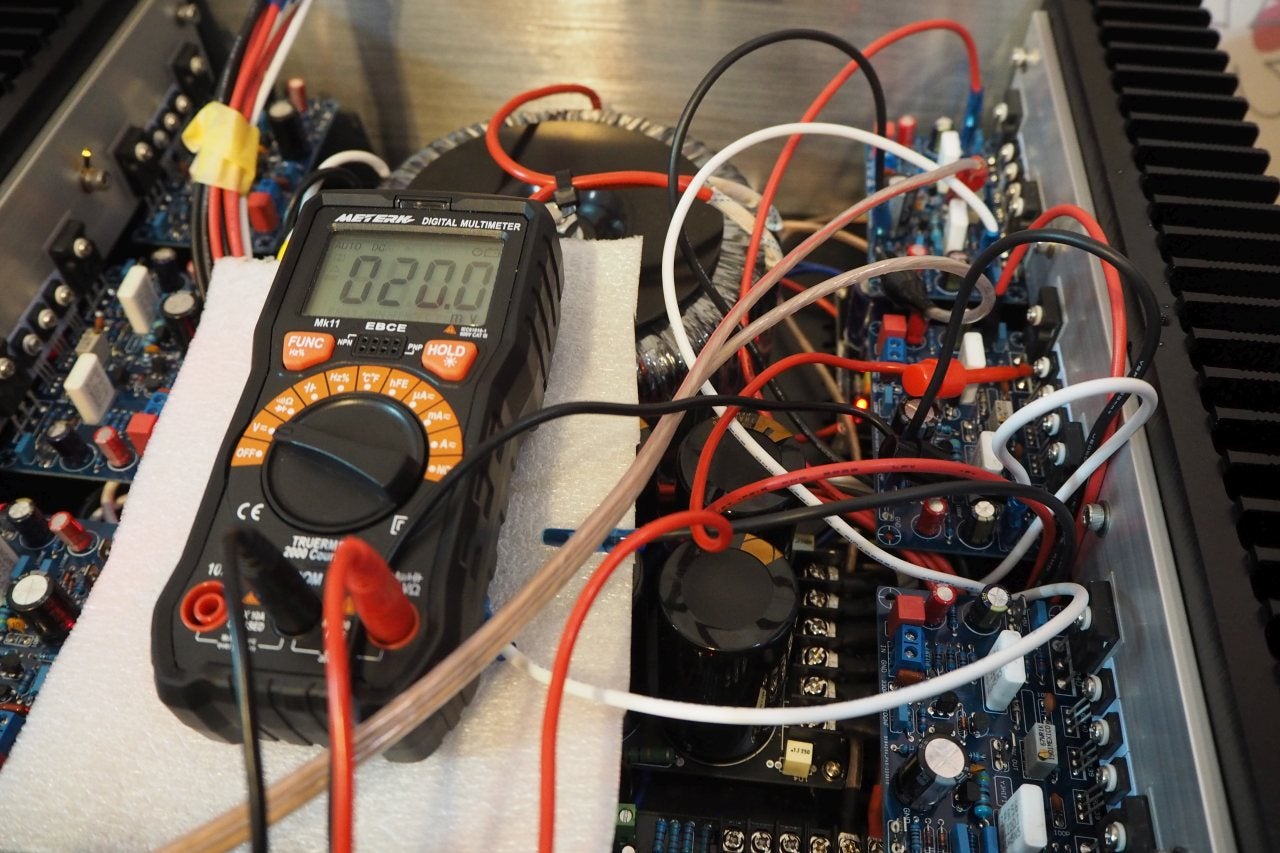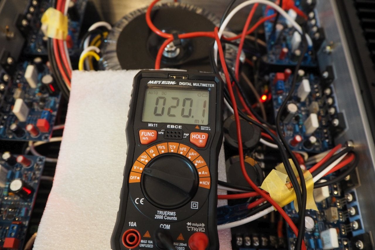 しばらくテスターをほったらかしにして、放熱器がほんのり温かくなってくると、バイアス電流は減る傾向になります。なので、少し多めに調整してから数分放置して安定するまで待ちます。
