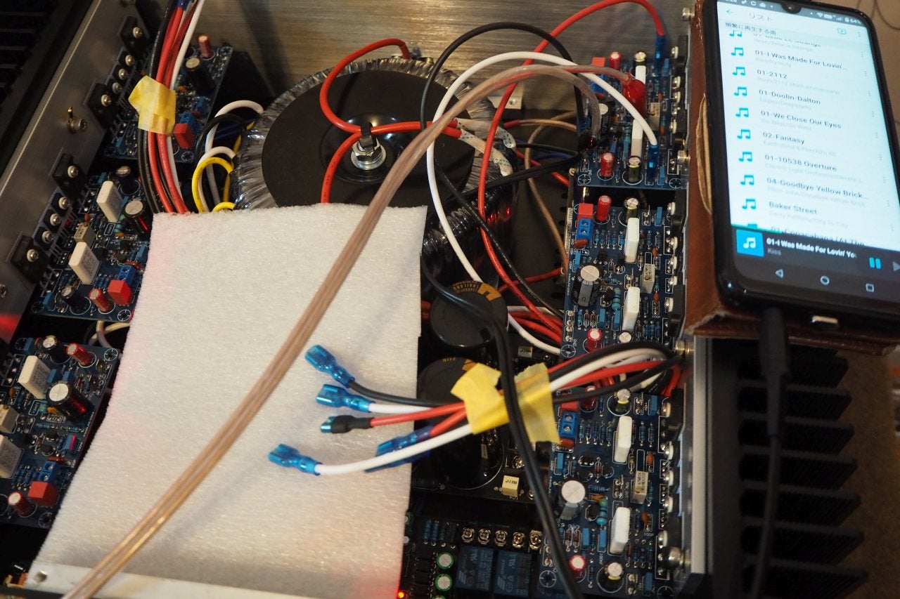バイアス調整が完了したら、ライン入力からスマホのイヤフォンジャックから音声を入れて簡易音出しチェックしてみます。