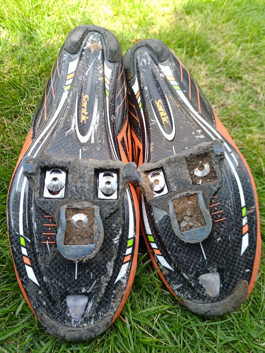 それでクリートはこんな有様。泥砂利ヅマリでまともにクリート嵌まらないし。まぁ元々相当ヘタっていたのですが、これで完全にダメになりました。交換です。
