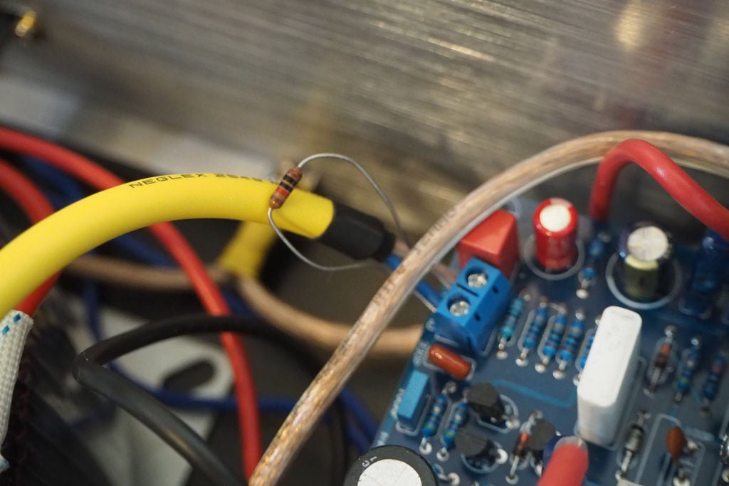 そこで、入力端を固定抵抗でショートしてみることにしました。つまり入力Zを下げます。このアンプPCBは極端に元の入力Zが高いわけでもないので、あまり期待はできないです。