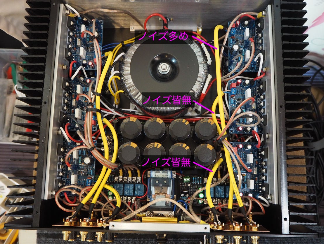 この、奥のケーブルが長いアンプ基板だけ、ノイズフロアが高いことが判明しました。