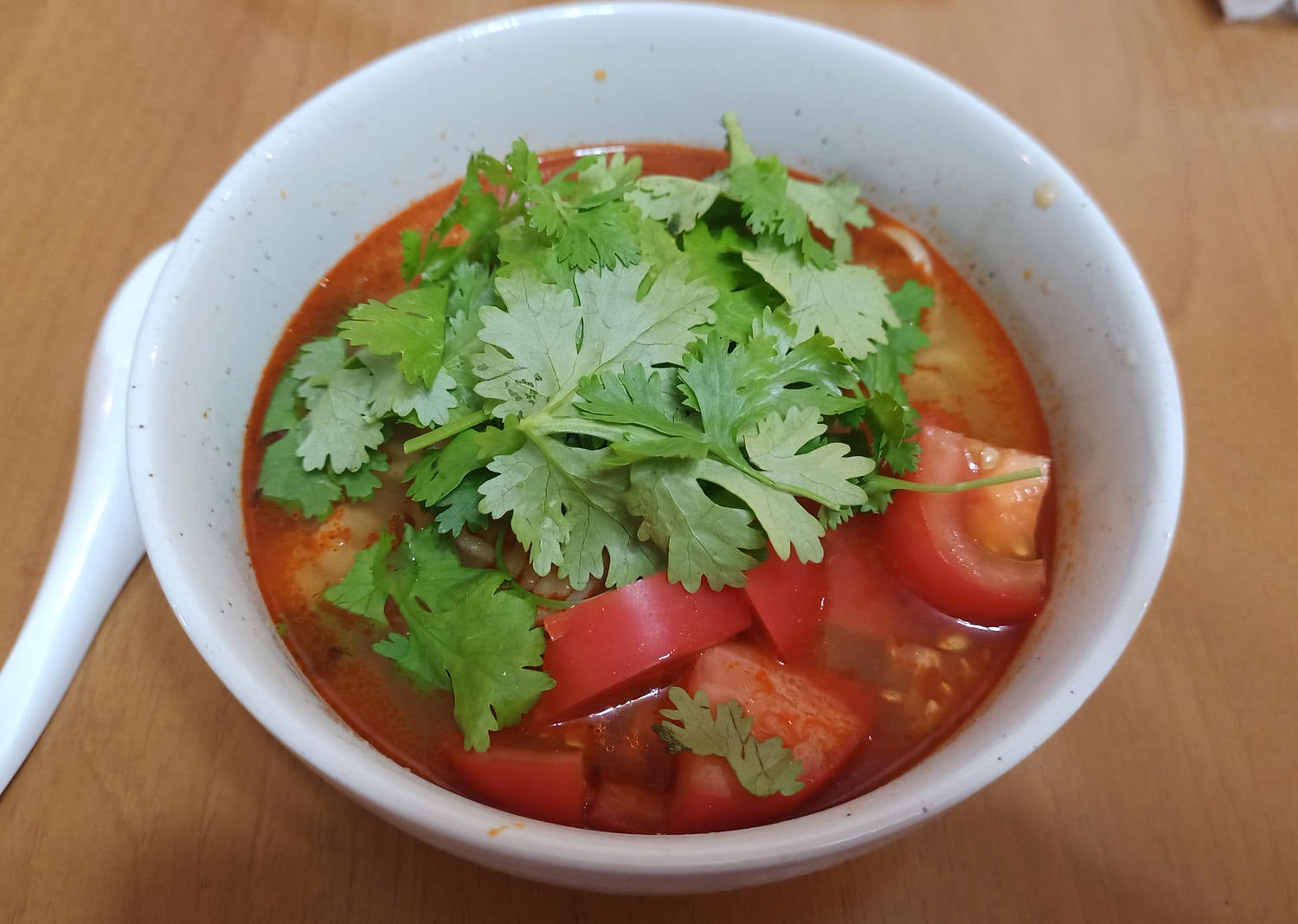 丼に麺を投入後に、トマトとパクチーをどっさり載せます。