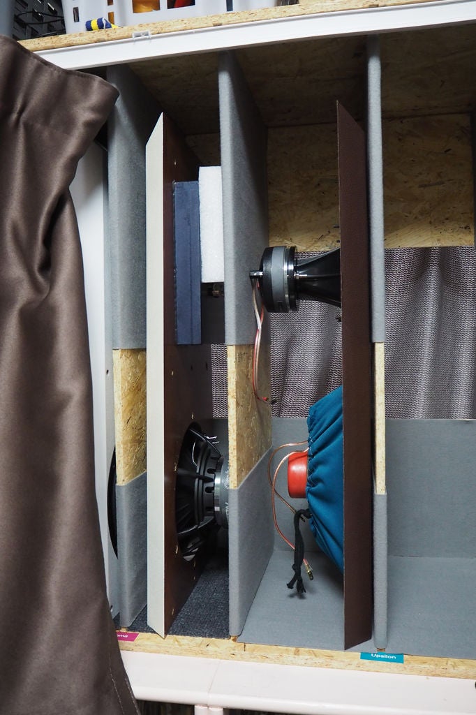 Upsilonを格納して、かわりにGammaバッフルを取り出している様子です。Upsilonのバッフルは軽くてラクだが、Gammaはガックリ重い。体感、2倍以上に感じられます。重い上に裸だから、当て傷を作ったりドライバにダメージが出ないようバッフル交換は毎回本当に神経を使います。緊張と重さで脂汗を垂らしながら作業している様子をご想像ください。