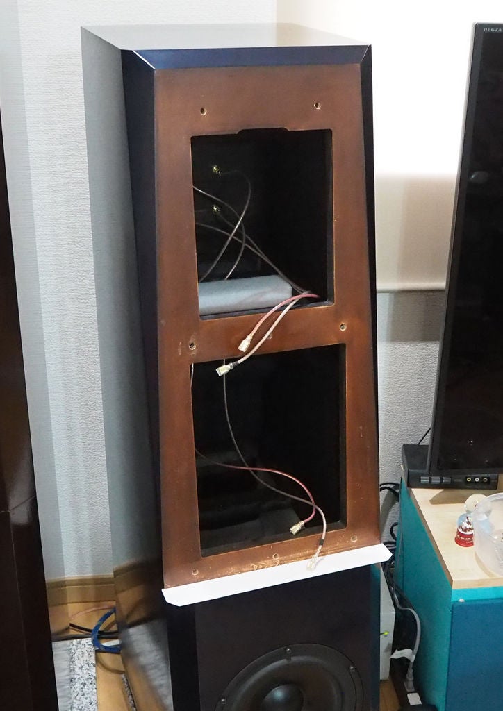 久々の開腹で中身が顕わになりました。Upsilonの左バッフルは少し本体に「固着気味」でしたが、どうすれば楽に外せるか経験則があるので全く慌てません。固着といっても完全な固着ではありませんしね。しばらくこじっていたら楽に外れました。