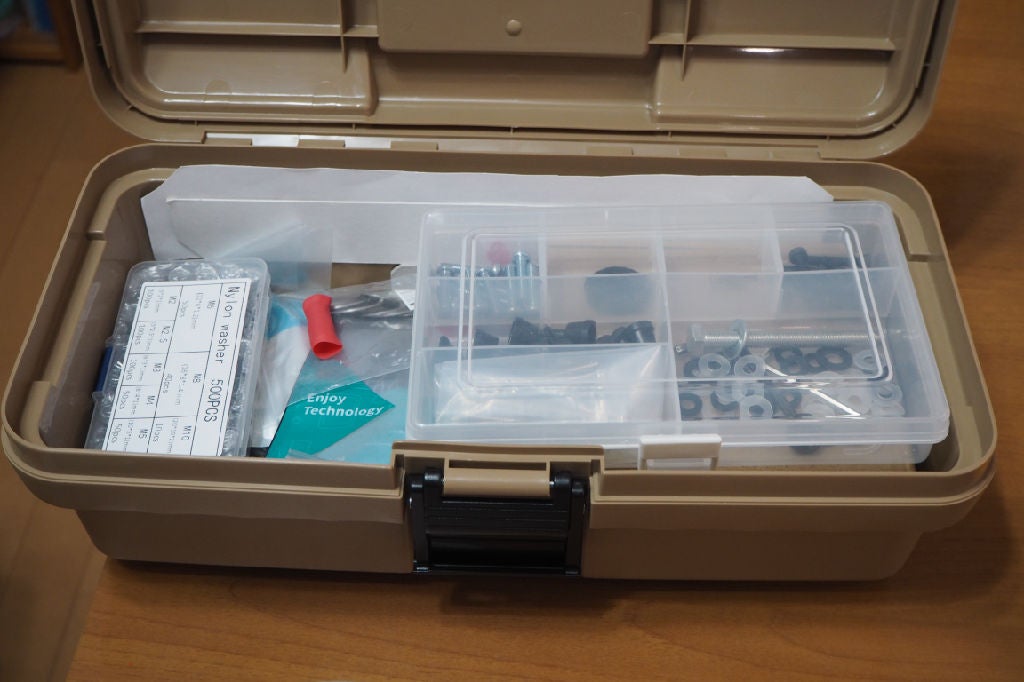 これは「Andromeda箱」と呼んでいる:ここにはAndromedaのバッフル交換、メンテナンス、PRs調整などに使うパーツがすべて入っています。でも交換用のファストンなどはここではない場所に収納しています。