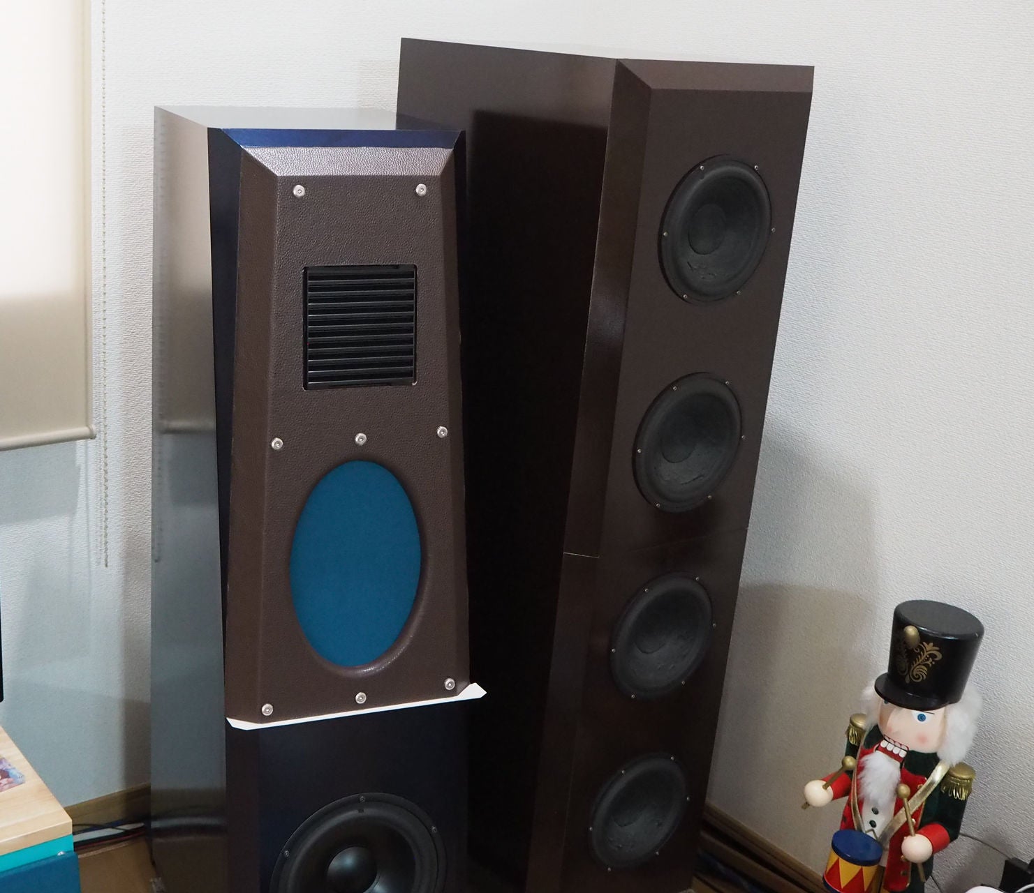 以前も吐露しましたが、Upsilonの革バッフルはヨレヨレです。張りたての頃はピ〜ンと張ってあんなに綺麗だったのに、時間と共にだんだん浮き、ヨレ、シワが出てきて、端の方なんか剥がれてきている部分もあります。・・・もう大失敗です。いい機会だから、皮をひっぺがしてゴム接着剤を溶剤研磨して、再塗装しようかとも思っています。ゴム接着剤を除去するのは本当に大変だと思いますが、テクスチャ塗装してしまえば粗がわからなくなると思う。