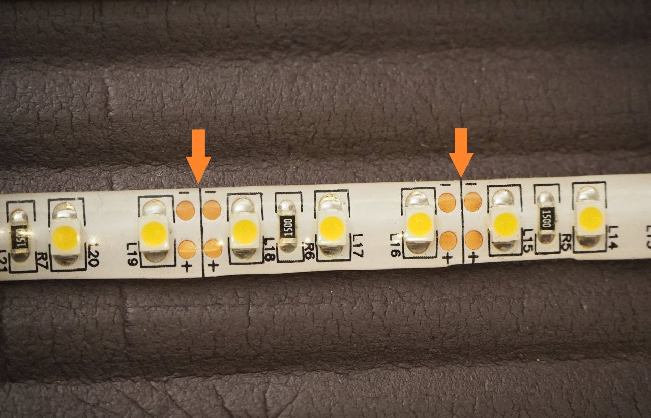 LEDテープは、印を付けたところまで =3LEDで1セットの回路を形成しています。