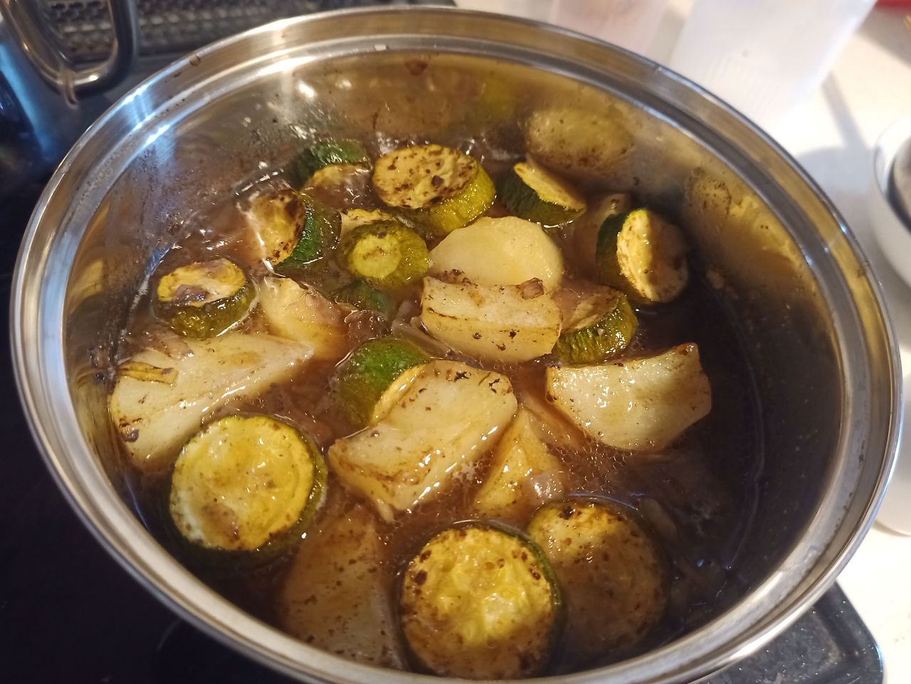 フライパンにオリーブオイル大さじ1を熱してから、一口大に切ったズッキーニx1、じゃがいもx2、マッシュルーム少々を炒めます。表面にこんがり焦げ目、しかしホロホロになるまでしっかり火を入れる必要はありません。こちらも”煮崩れを防ぐため”の炒めです。
