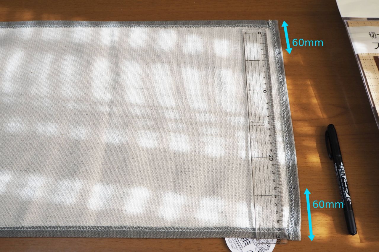 短辺方向に、外側から60mm, 60mm の場所*に目印を描きます。