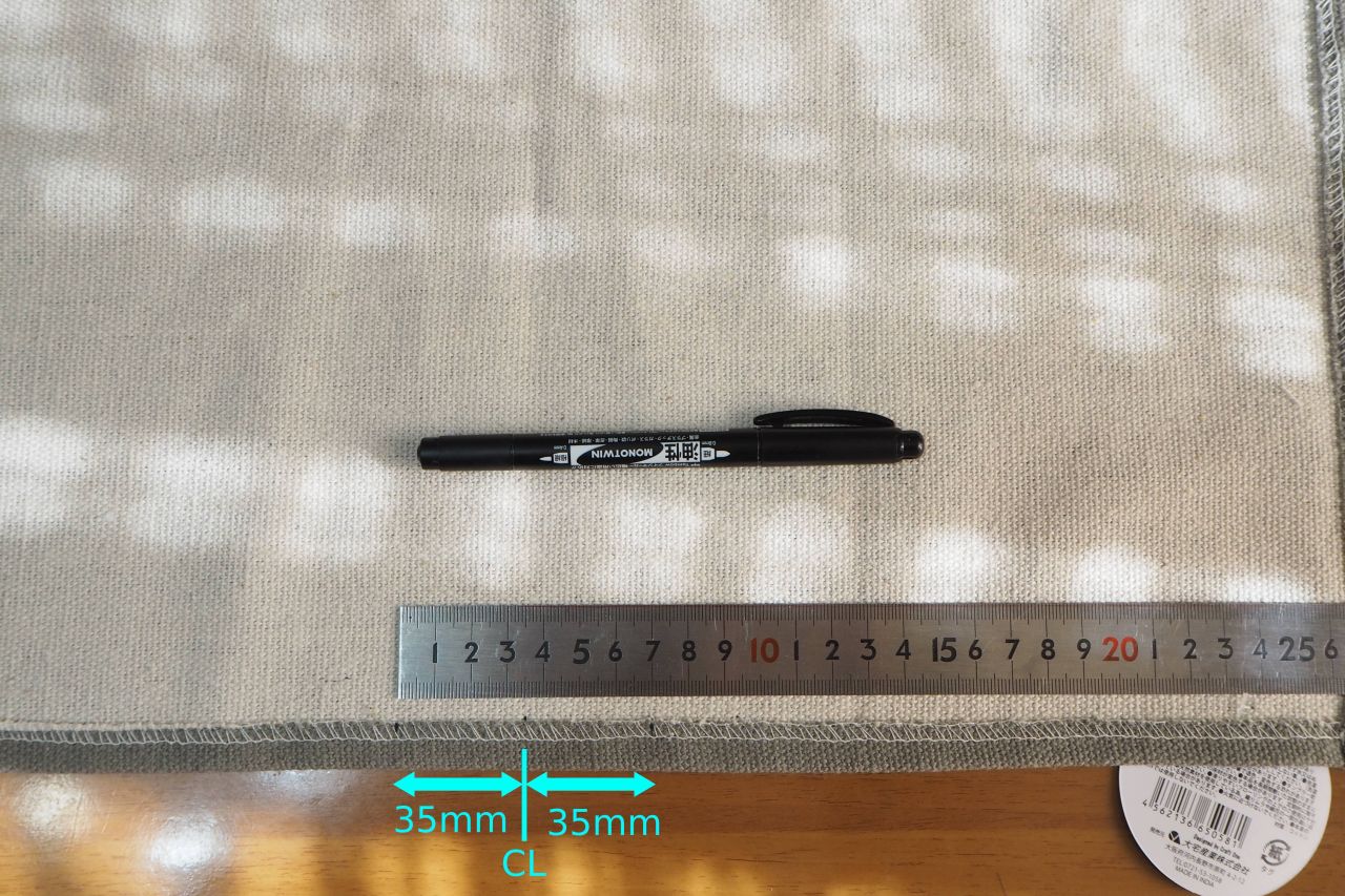 まずセンターを出して、そのそれぞれ左右35mmの箇所にケガキします。27cmの布とのことですが、実測すると28cmもあるので、CLは14cmの場所でした。CLは上下とも実測が大事ですね。