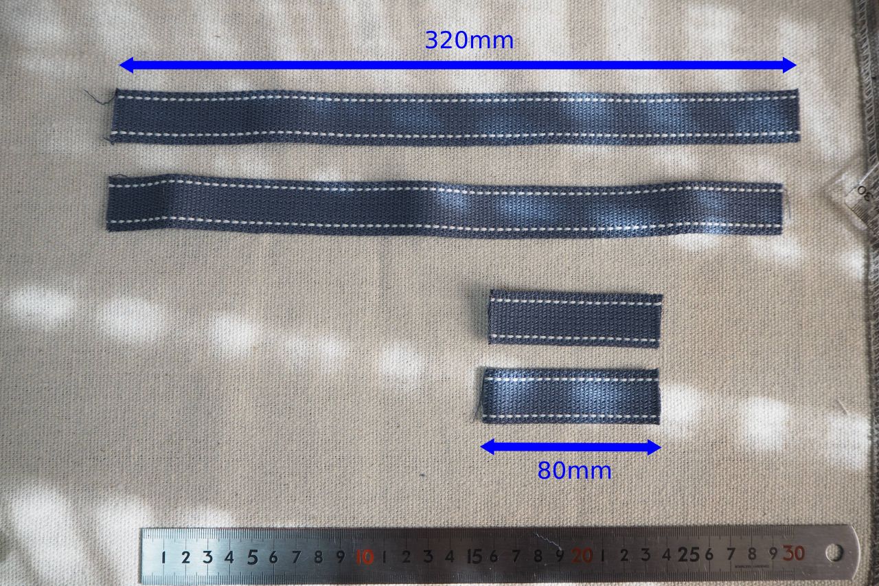 前述の 60mm – 60mm でケガイた「内側」へ320mmのリボンを縫い付けます。