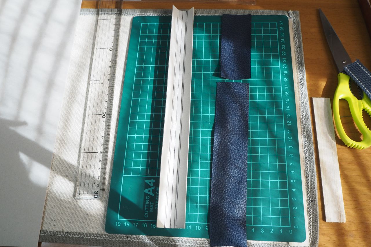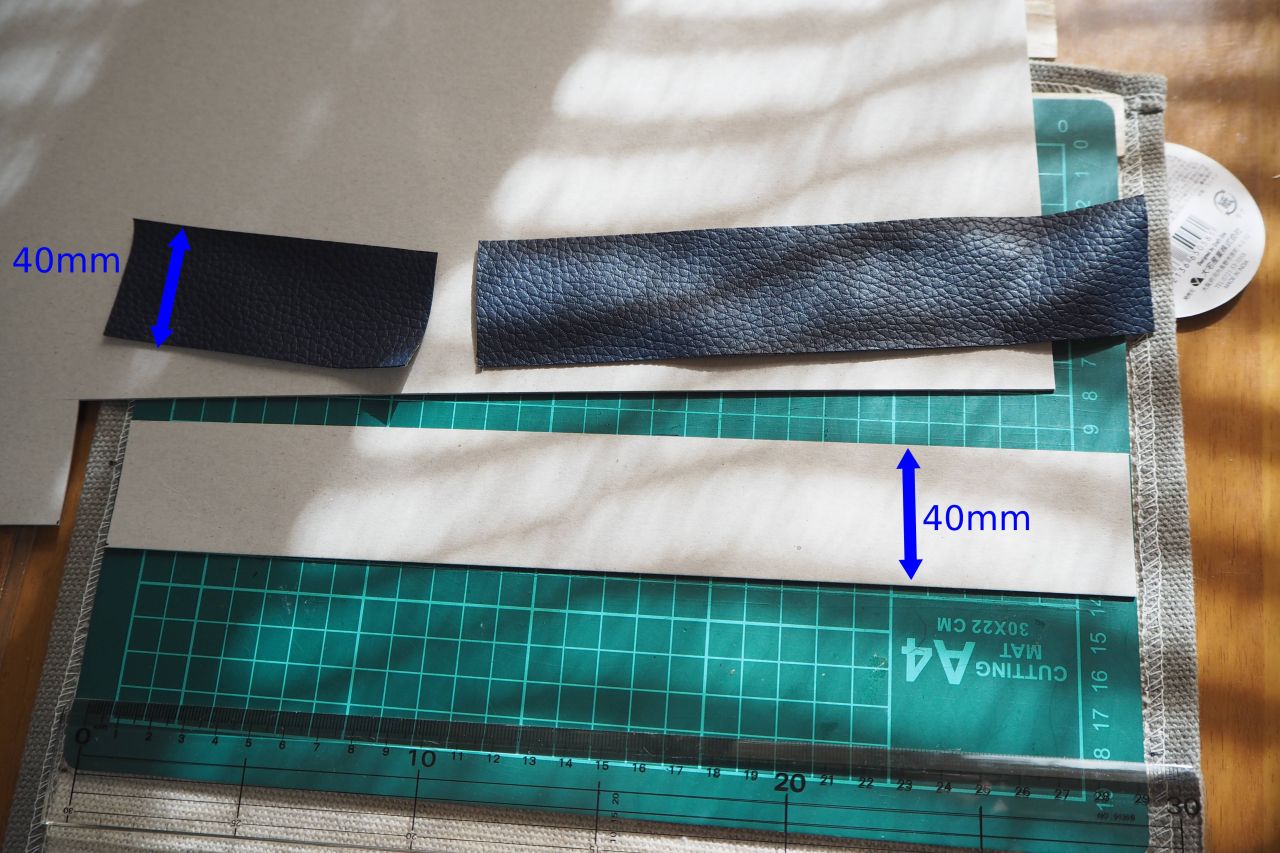 今回は余っているボール紙、余っているフェイクレザーを切って使いました。腰があったり養生できたりすれば素材は家にあるものでなんでも良いと思われます。
