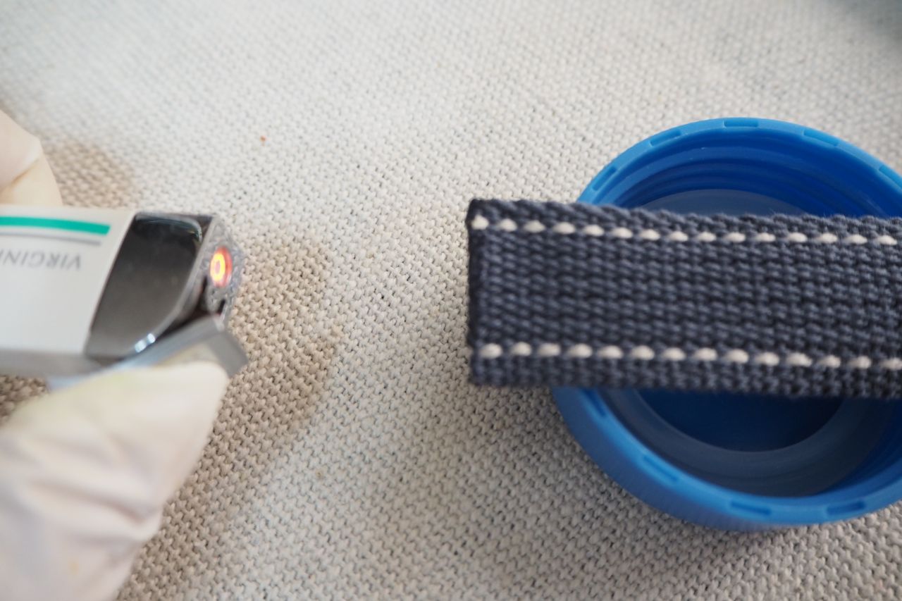 さらに、リボンの端面は糸がほつれやすいので加工します。ここをジェットライターなどで軽く炙っておくと、ほつれにくくなるそうです。知ってました?私は作ってる最中に、嫁にこれを教わりました。