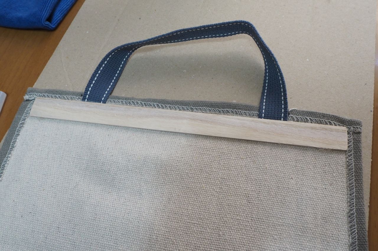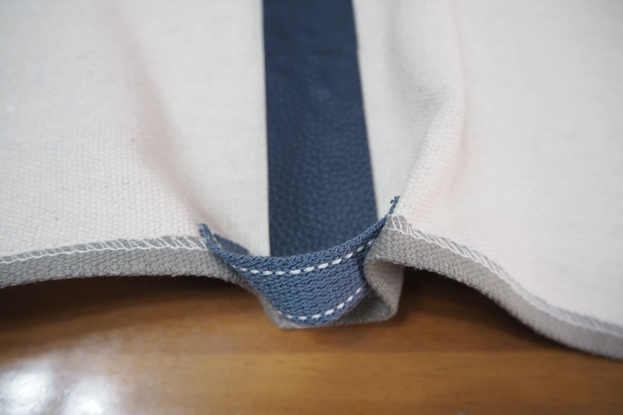 *この場所は布のサイズによって最適値が変わります。外すぎてもいけないし、内側すぎてもいけない。重心上もっとも安定する箇所にバンドを取り付けるわけです。