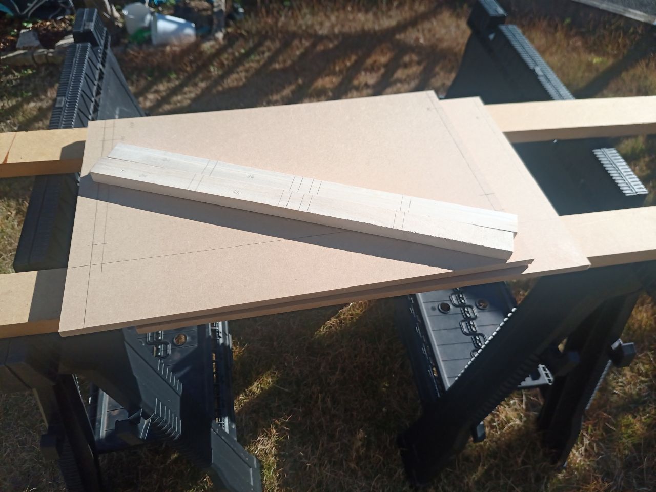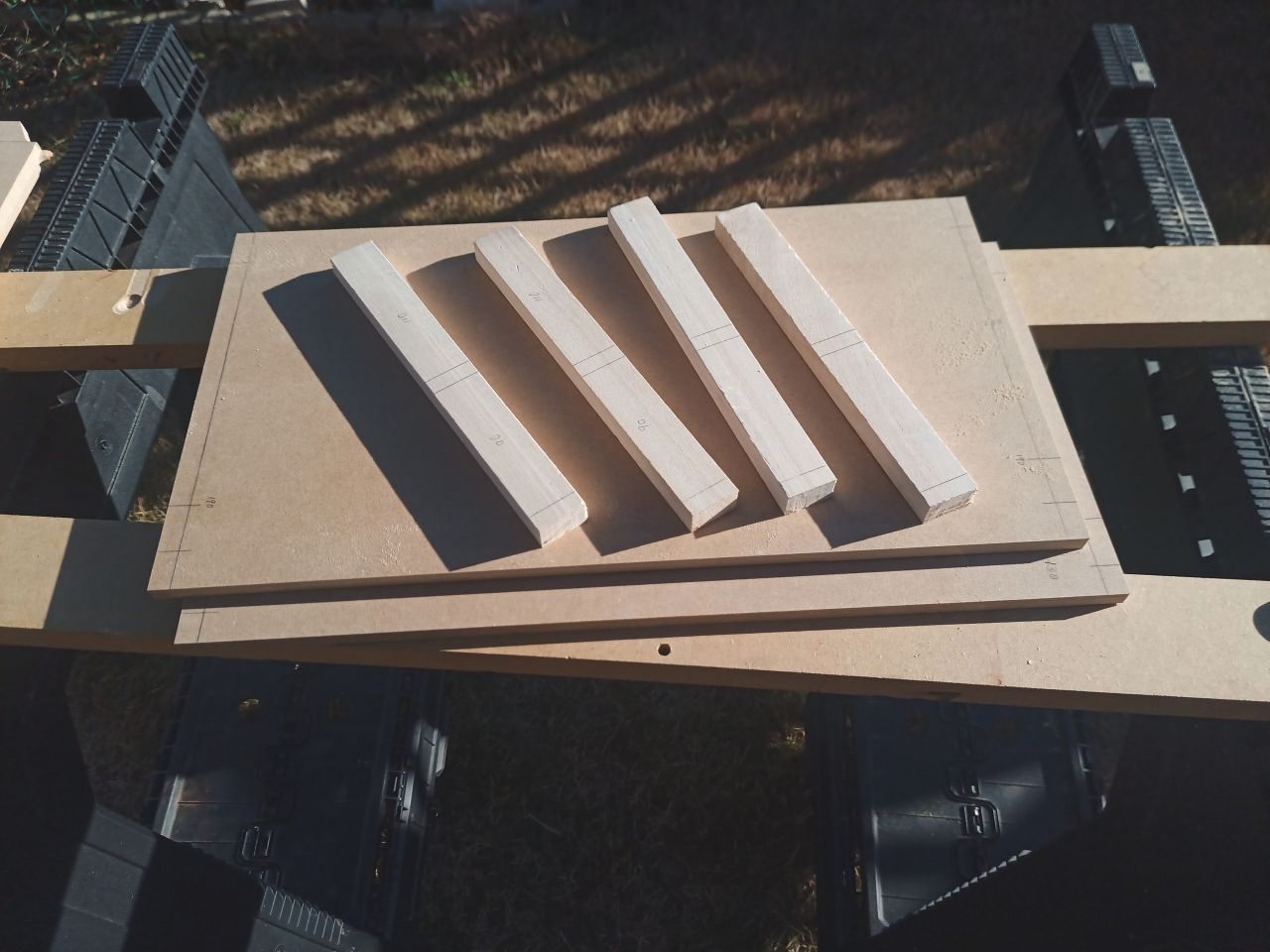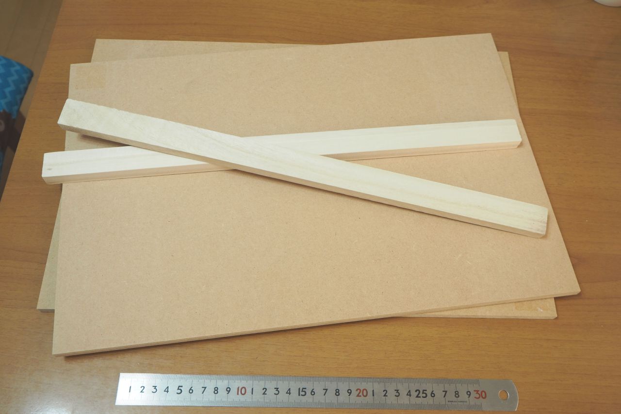 とはいえ・・・買ってきた支柱はセリア製。100円で2本入っている角材。棚板はジョイフル本田で買ってきたMDF。1枚300円くらいだったかな? 相変わらずそんなにゴージャスなものではないです。