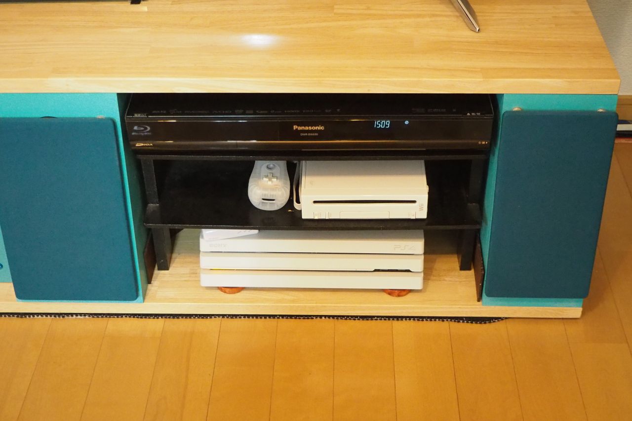 DIYしたテレビラックは支柱であるDIY自作スピーカーが支え、さらにそのラックの中にはDIYした子ラックが収まるという。DIYの権化のようなテレビ台。いっそのこと、この中に収納してる2.1chアンプも自作するか??