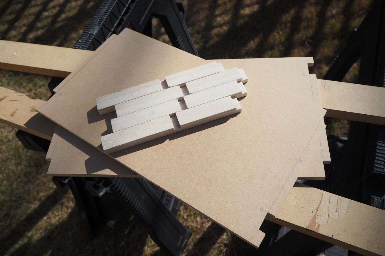 全パーツの加工が終わったようす。部材がモロかったりするので、大きく欠けたり毛羽ったり。決して完璧ではありませんが、見えない箇所なら無問題。