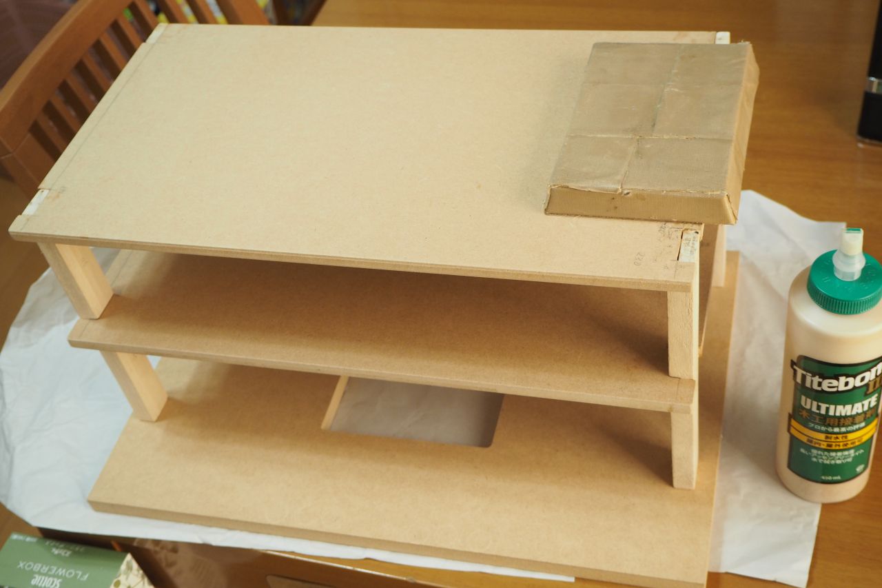 トータルコストは700円というところ。以前の百均棚よりは高くつきました。さすがに百均のMDFよりは厚くて頑丈ですが、それでもスピーカーのように極厚なものではなく、脆弱です。