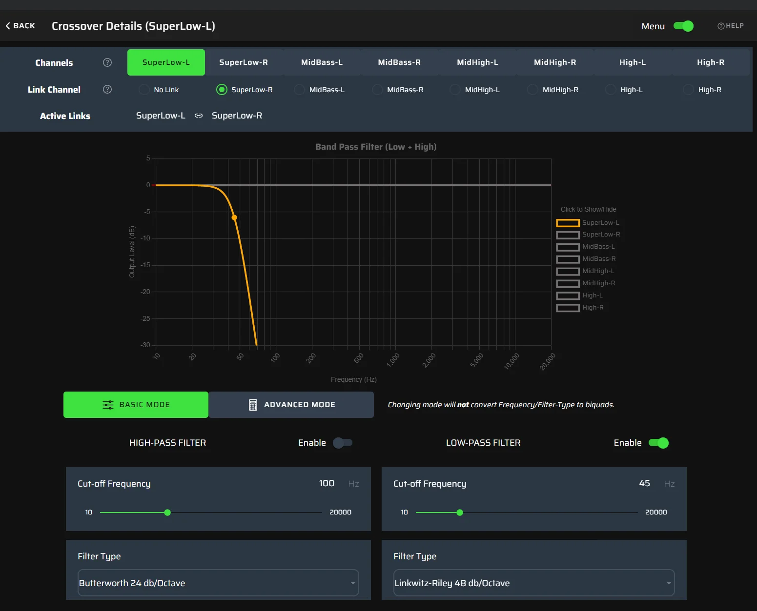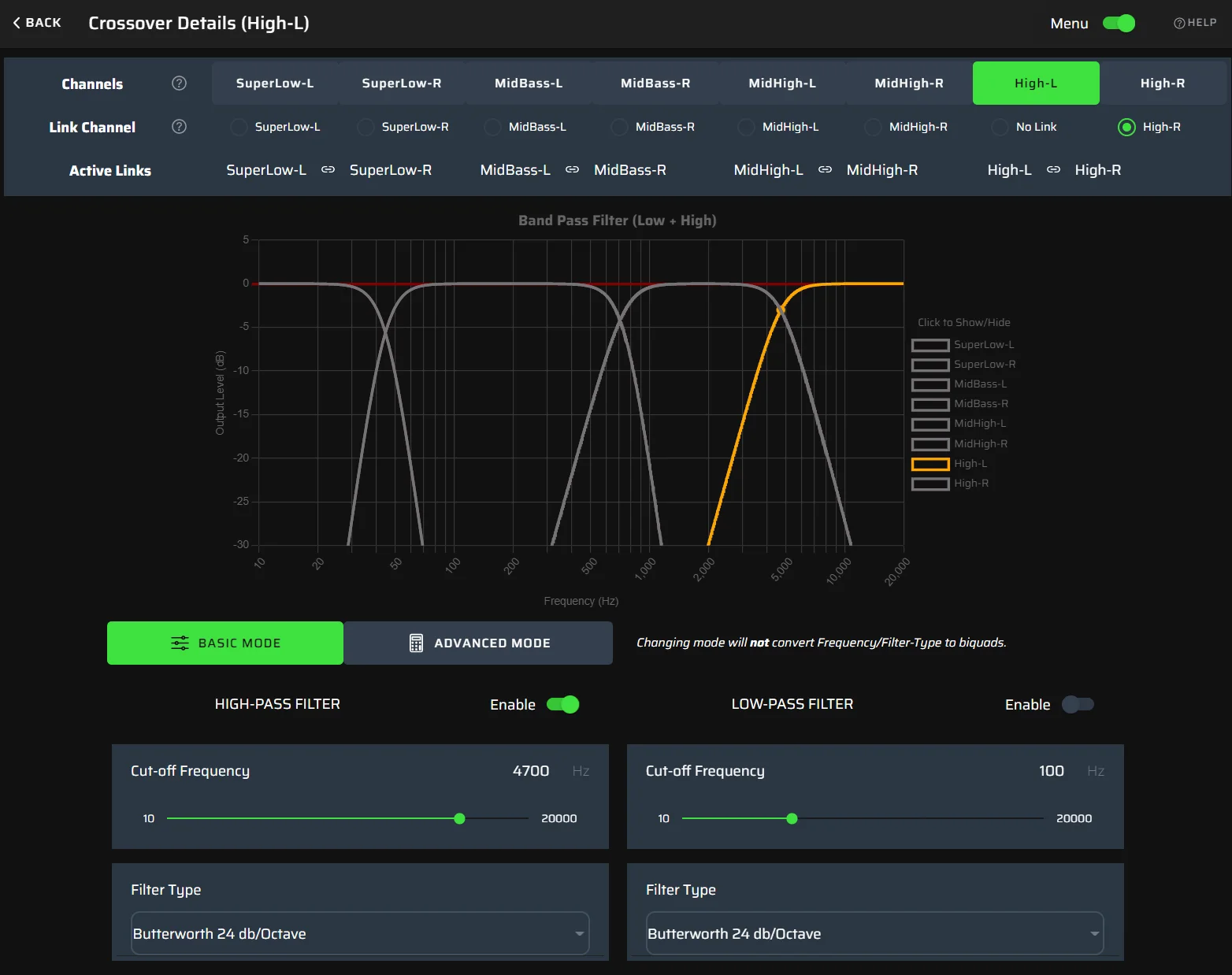 同じように、Midbass, Midhigh, Highチャンネルに対してもフィルターを設定していきます。