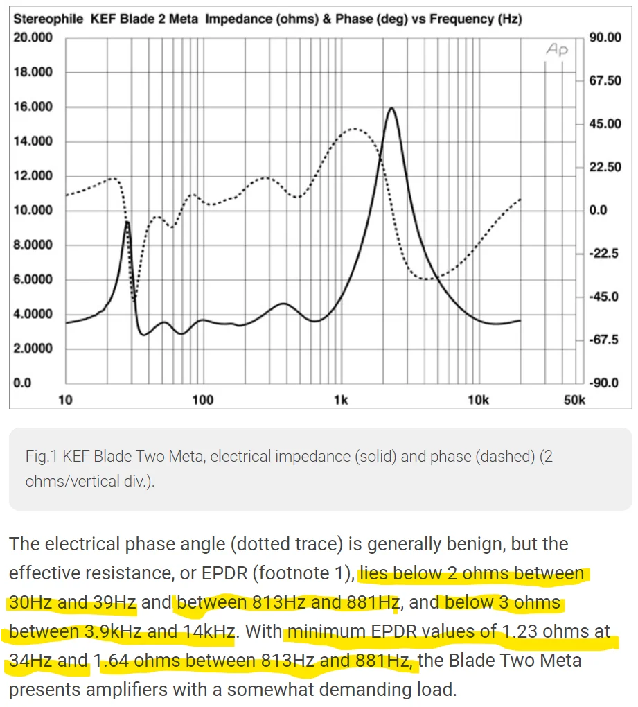 いつの頃からか、クロスオーバーを内蔵しているラウドスピーカーの最低インピーダンスは急転直下の一途を辿った。「公称インピーダンス」などというものは何の意味もなさないので信用してはいけません。(Blade twoで公称は4Ω、しかし実効EPDRは1.23Ωですから。)