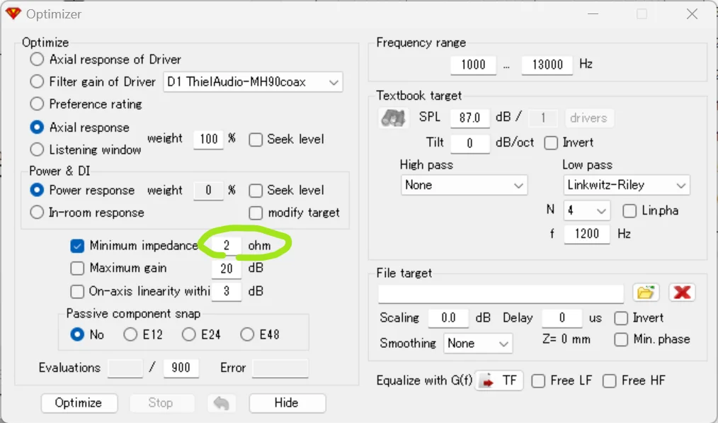 ここのチェックを怠ってオプティマイズを走らせると、オプティマイザは無制限にインピーダンスを低下させるように動作してしまいます。つまり、強い位相・振幅補償はインピーダンスの低下=アンプの負担上昇とトレードオフにあります。