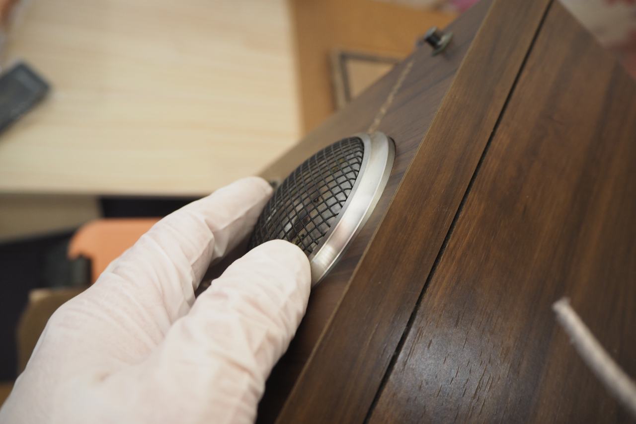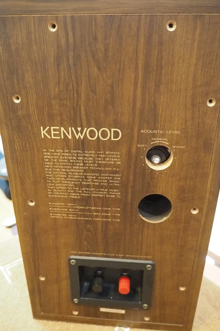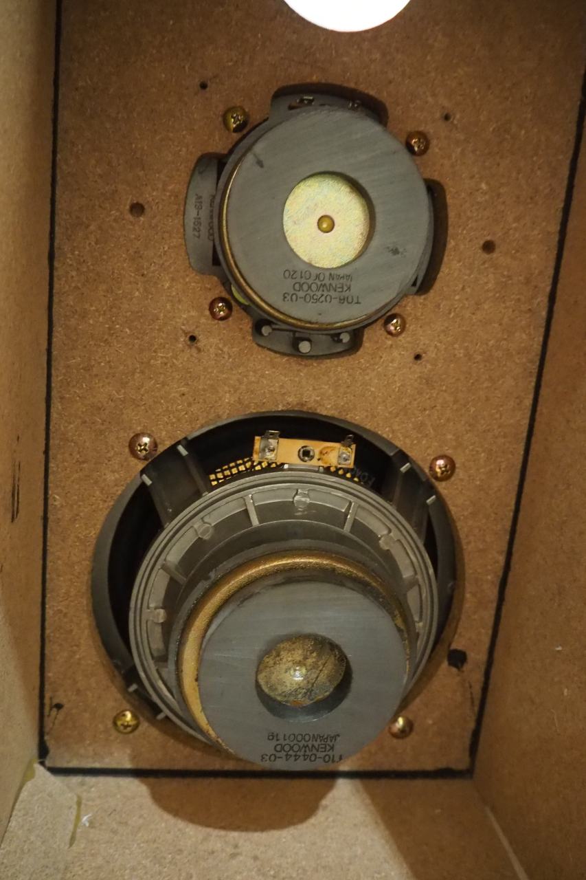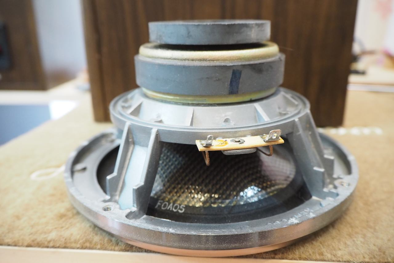 このスピーカーはドライバーが内部からビス圧着されており、裏板を外さないかぎり内部に全くアクセスできません。だから前面にビスが見えないのね。。。古い年代の国産スピーカーにしては裏板までしっかりお化粧され、プリントまで入っていて、そうしたガワへのコスト投下が凄いなと思います。ドライバーも見た目高級感ありますしね。でも裏腹に中がしょぼいんだな。