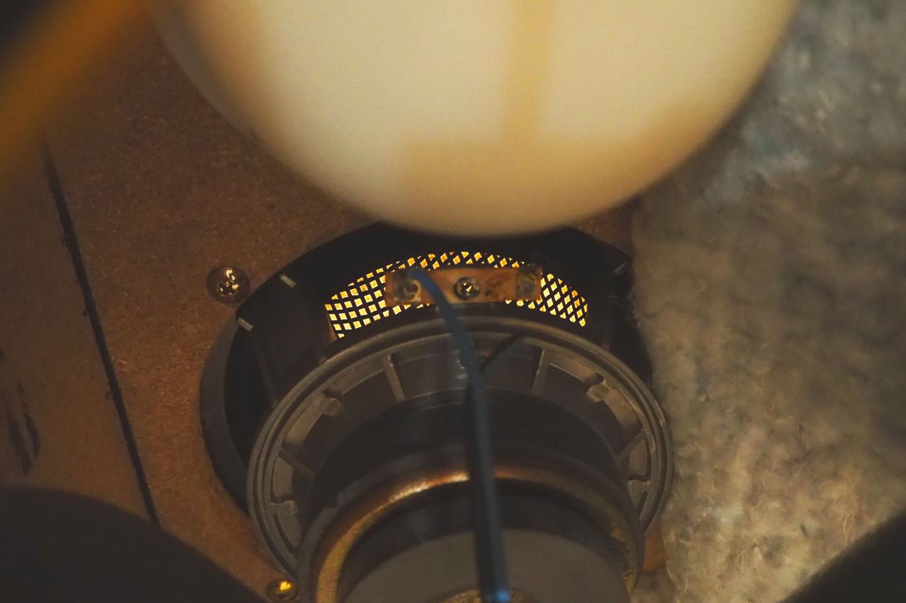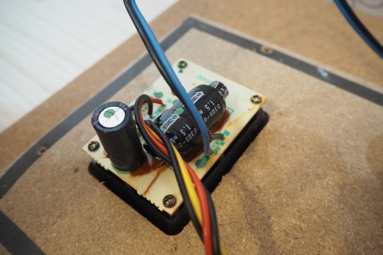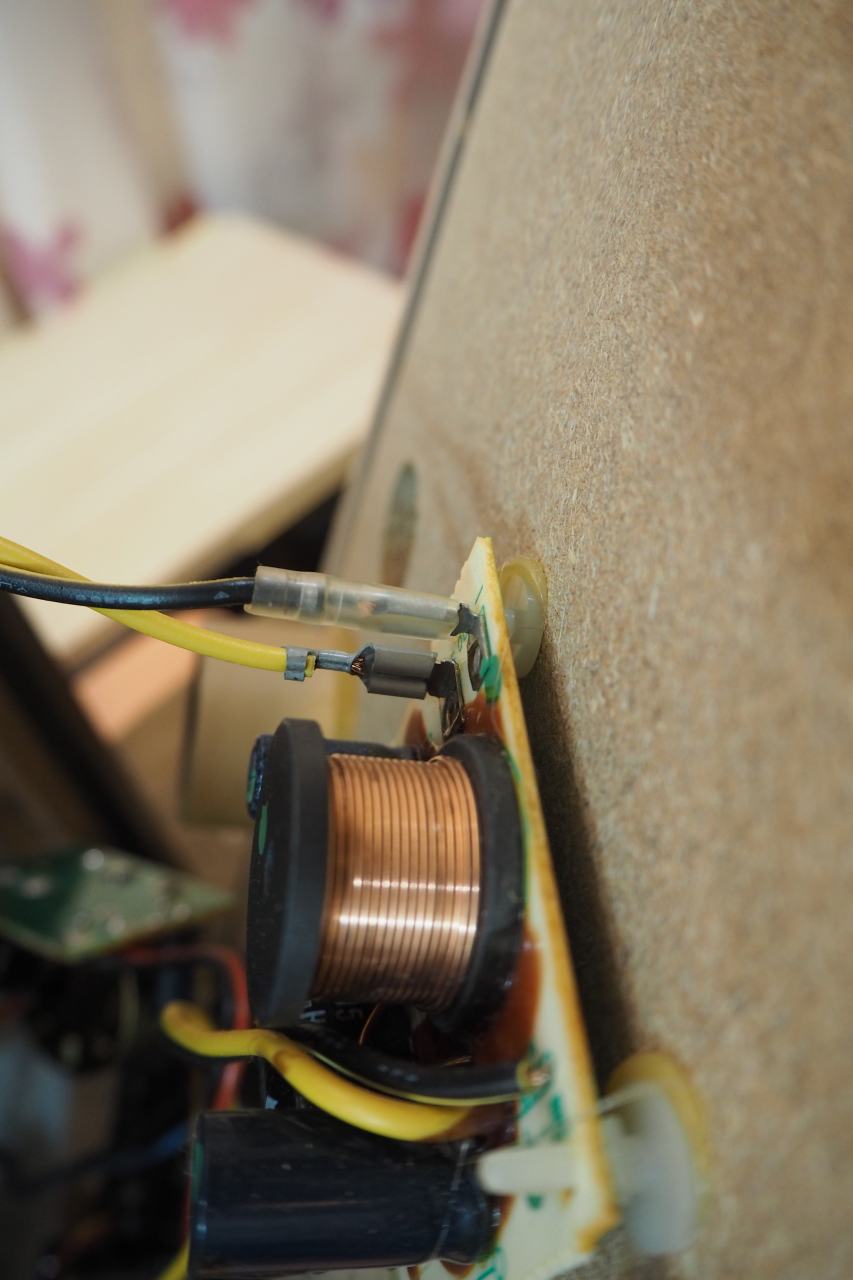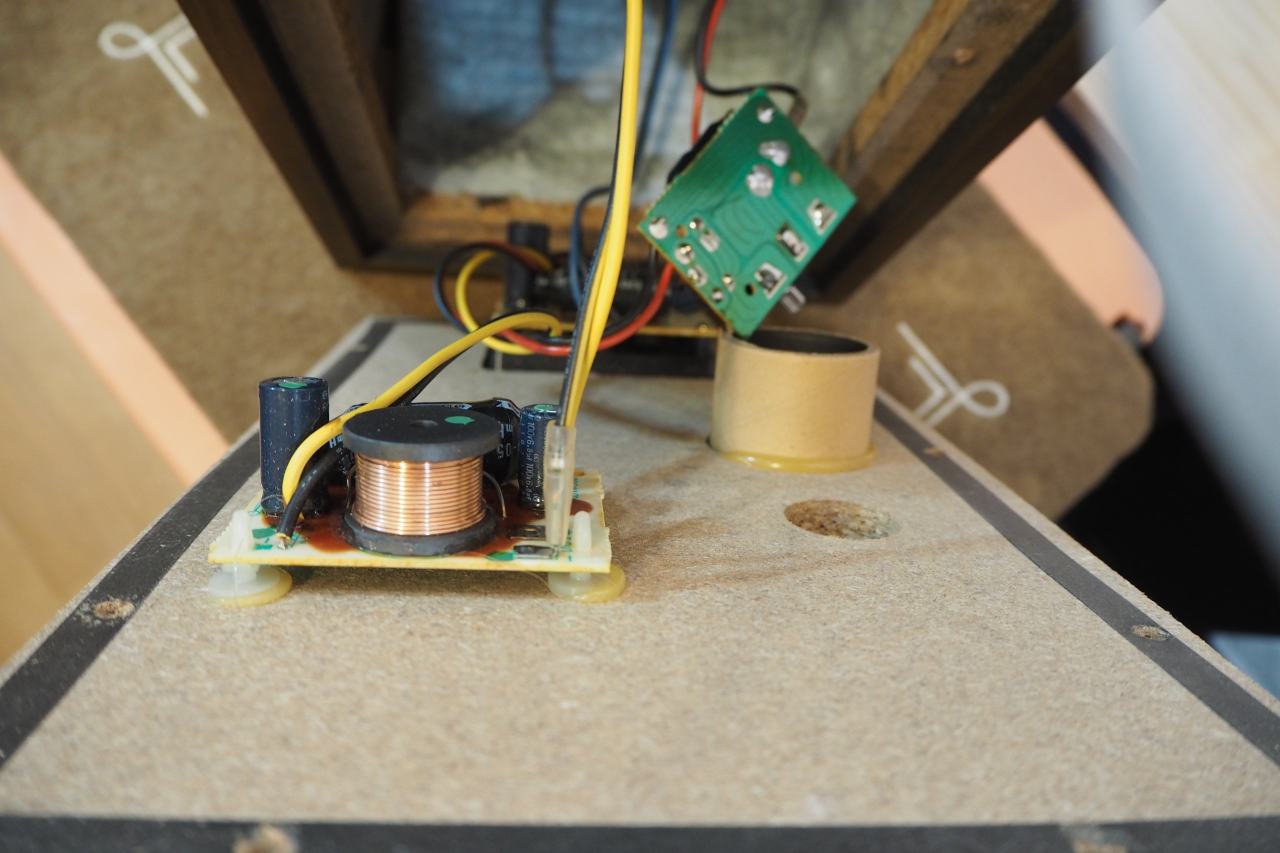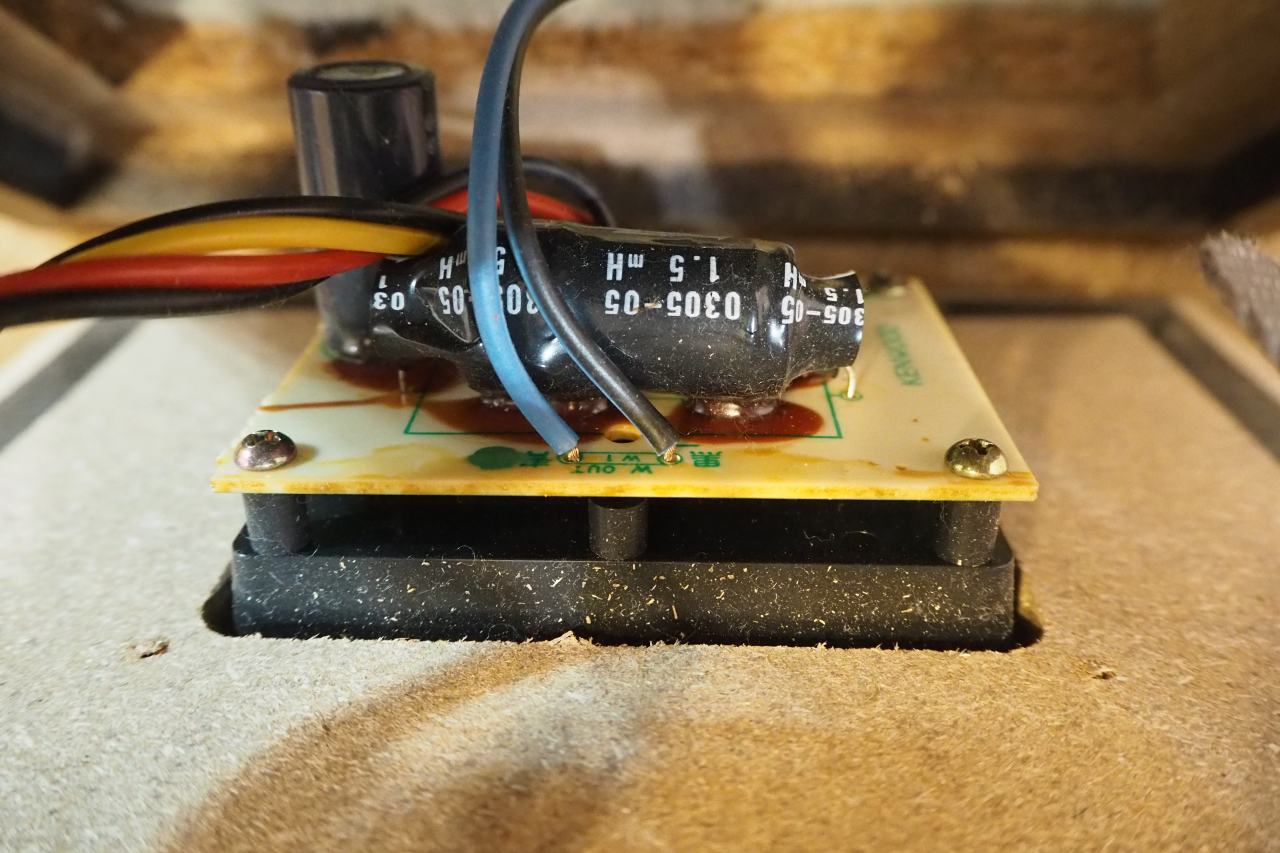 スピーカーターミナルの裏側に、ウーファークロスオーバーが直付けとなっています。ウーファーへの結線だけが、ファストンではなく直出しになっており。これが地味に不便。