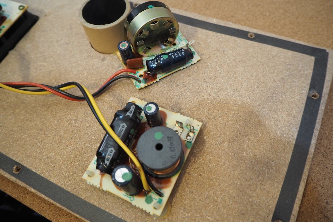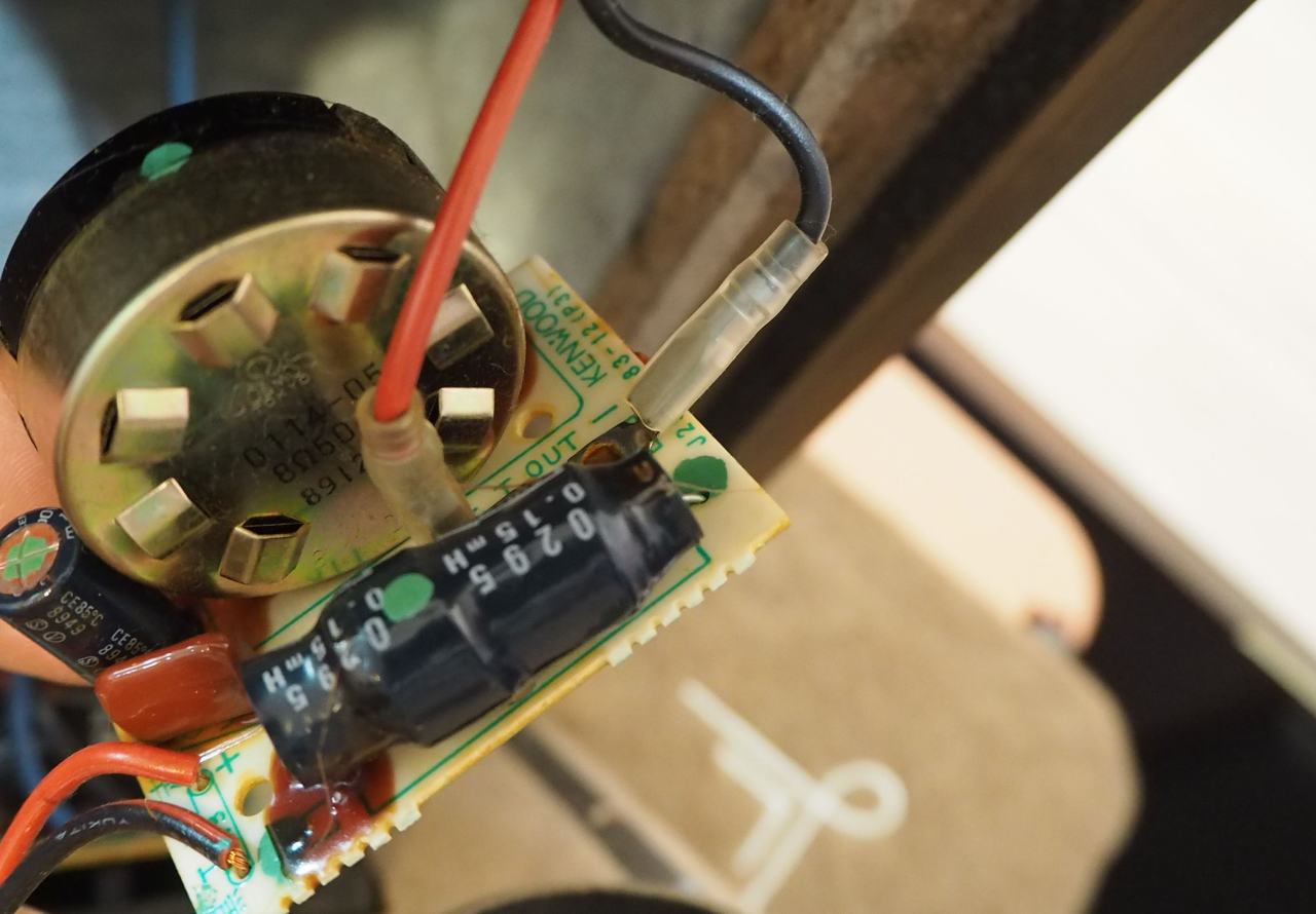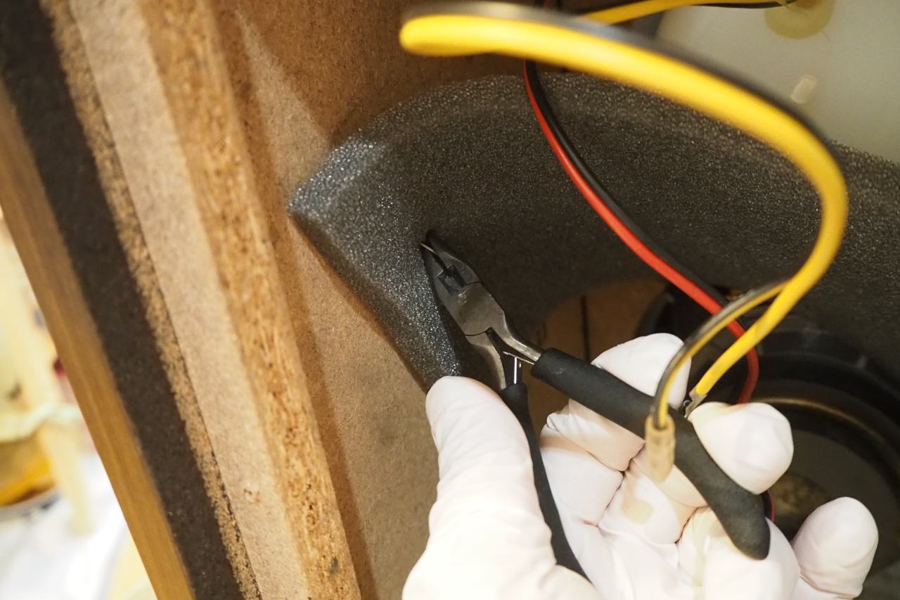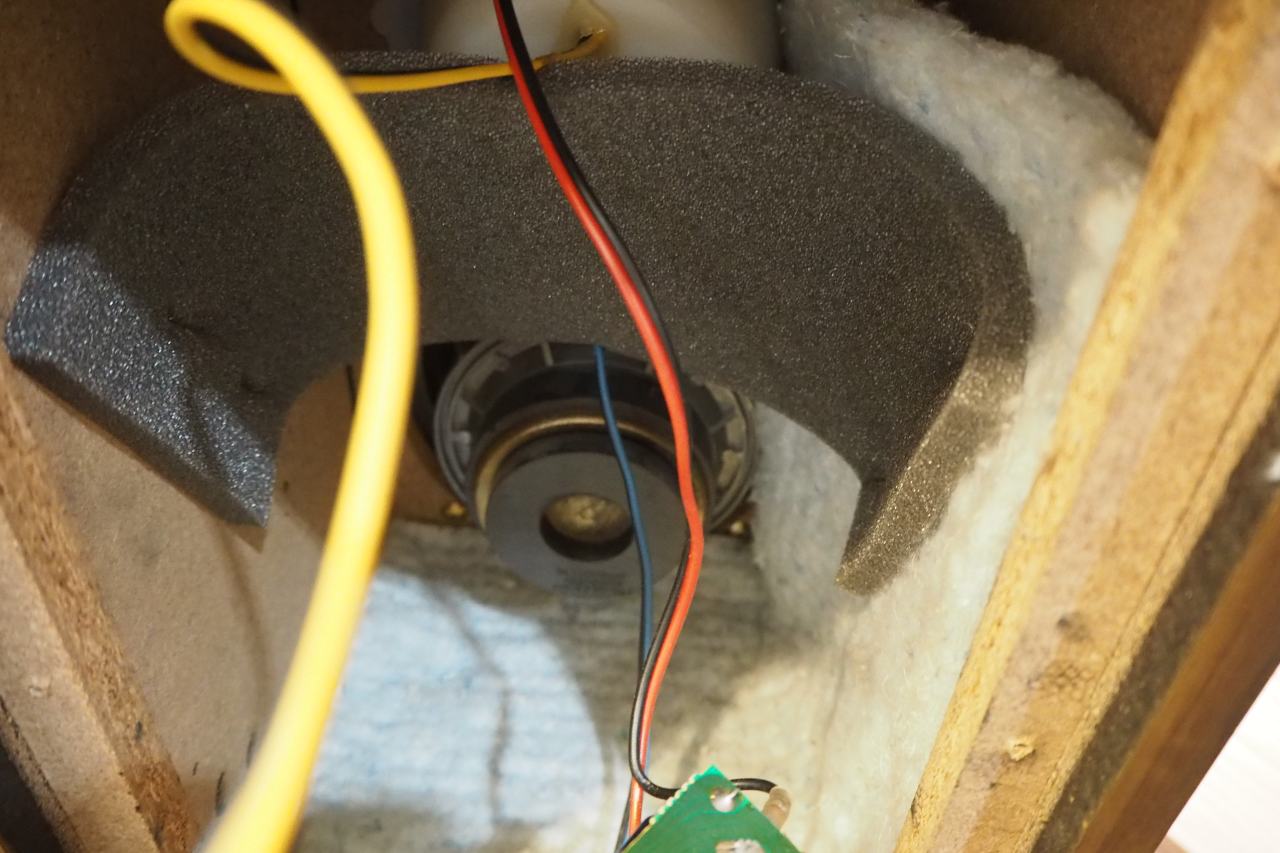 スピーカーターミナルの裏側に、ウーファークロスオーバーが直付けとなっています。ウーファーへの結線だけが、ファストンではなく直出しになっており。これが地味に不便。