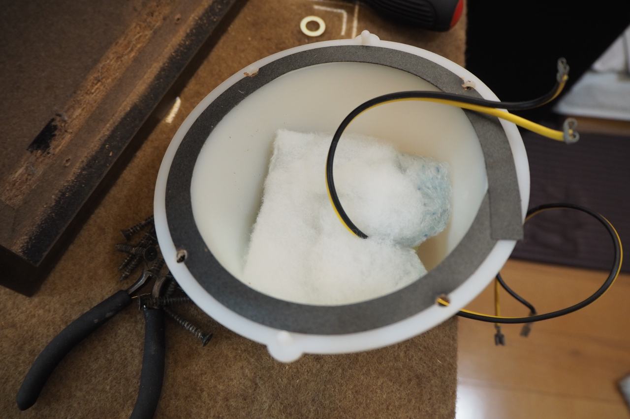 といっても、ミッドレンジのマグネット分を抜くと1L前後しか無い感じ。申し訳程度に吸音材が詰めてあります。